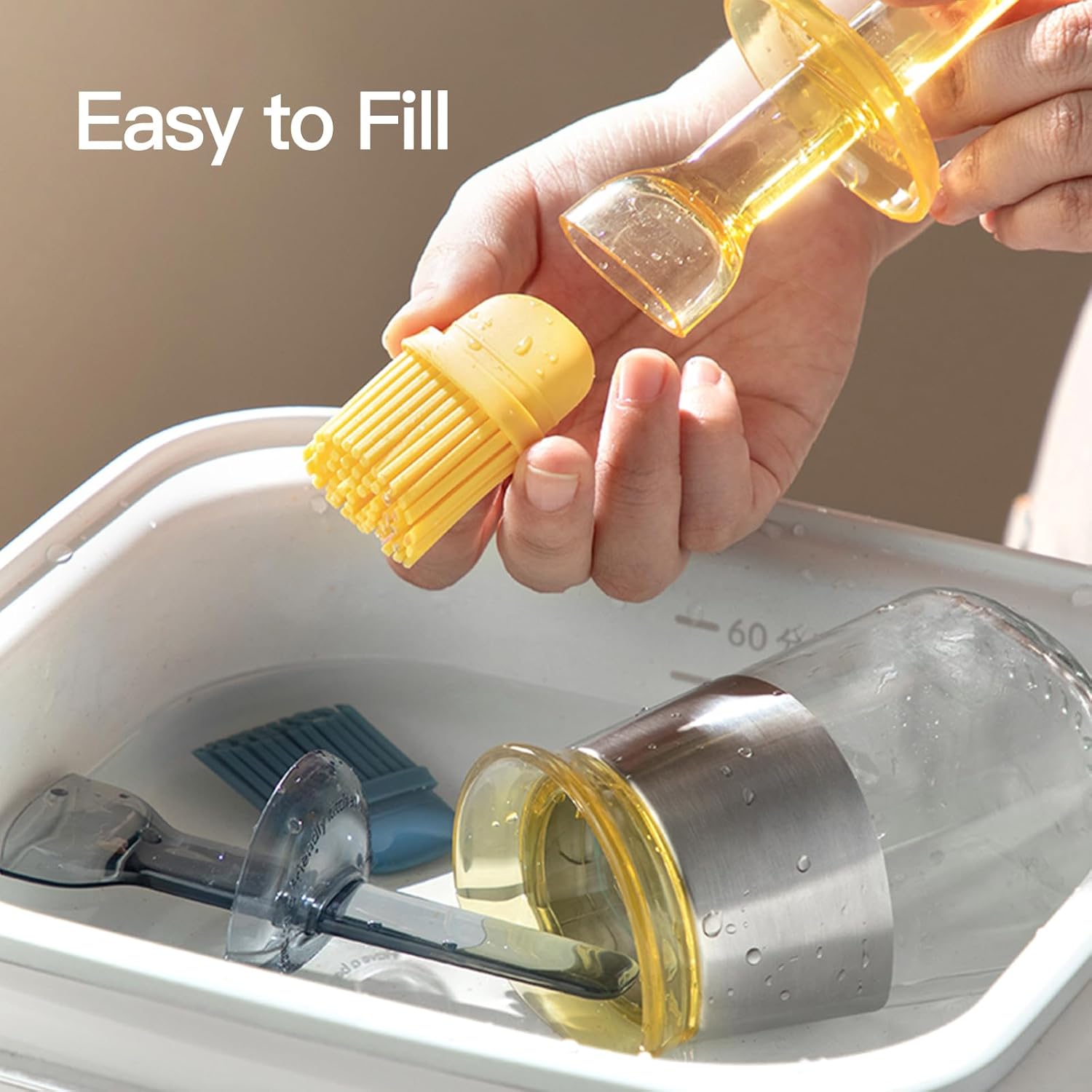 - 【Portable Silicone Oil Brush Bottle】This oil brush bottle for cooking has a beautiful appearance, kitchen oil dispenser bottle mouth with a widened caliber for easy refueling, you can use the silicone brush brush to brush oil on pots and pans or grilled food. The silicone oil dispenser brush with olive oil container makes brushing oil more convenient than traditional dispenser brush, safe and healthy