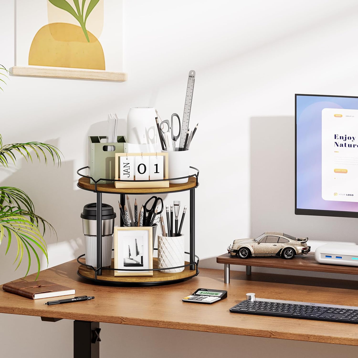 - 1. Stay Organized in Style: Ditch clutter and stay organized with our two-tier turntable Lazy Susan! This beautiful wooden rotating spice rack spinner is perfect for any table top, farmhouse bathroom decor, round decorative tray for your vanity, counter, sink, coffee table, and much more