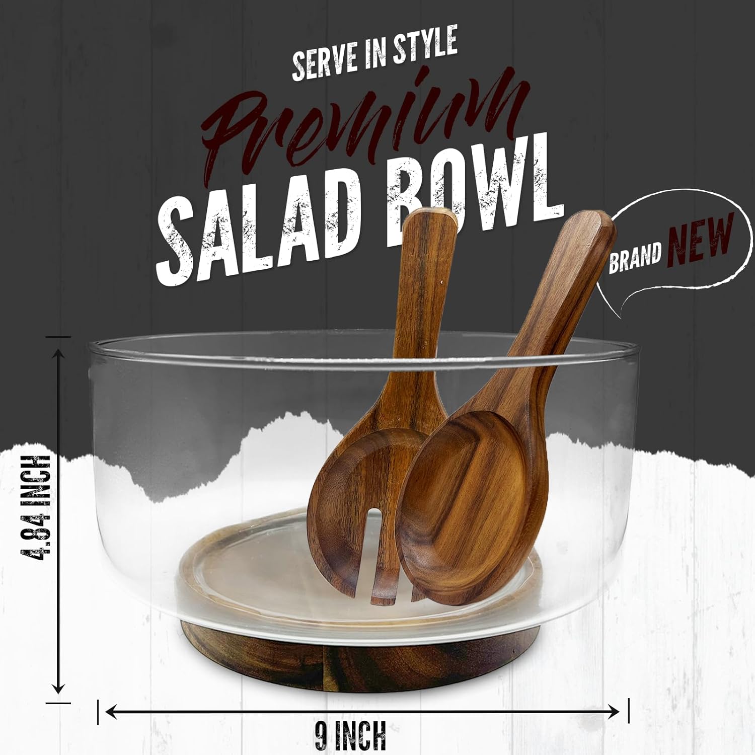 - Included Components : Large Glass Salad Bowl Set with Acacia Wood Base and Serving Set Utensils