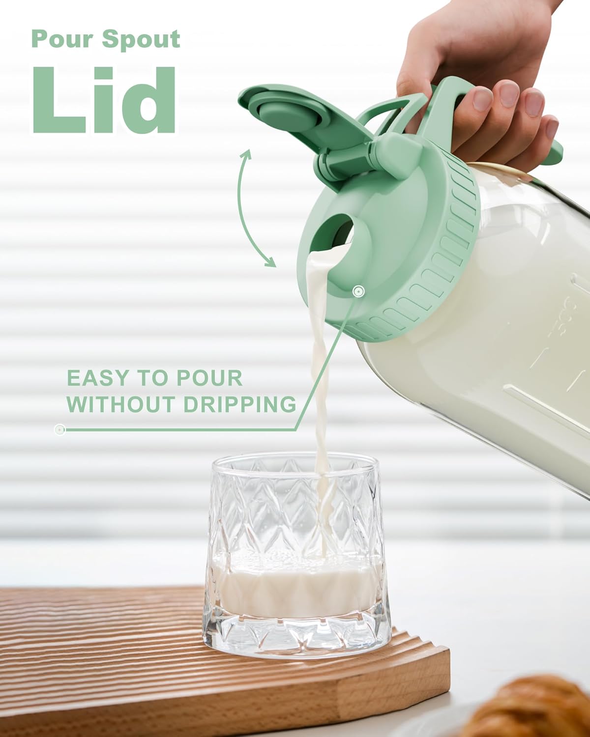 64oz Glass Breast Milk Pitcher with Lid & Pour Spout, 2 Quart Airtight Leakproof BreastMilk Fridge Storage Container - Wide Mouth, Dishwasher Safe Formula Pitcher with Handle