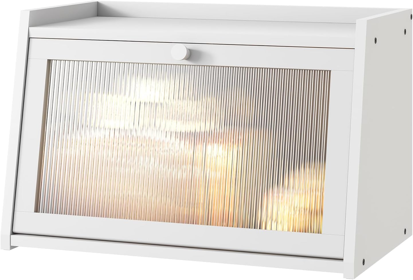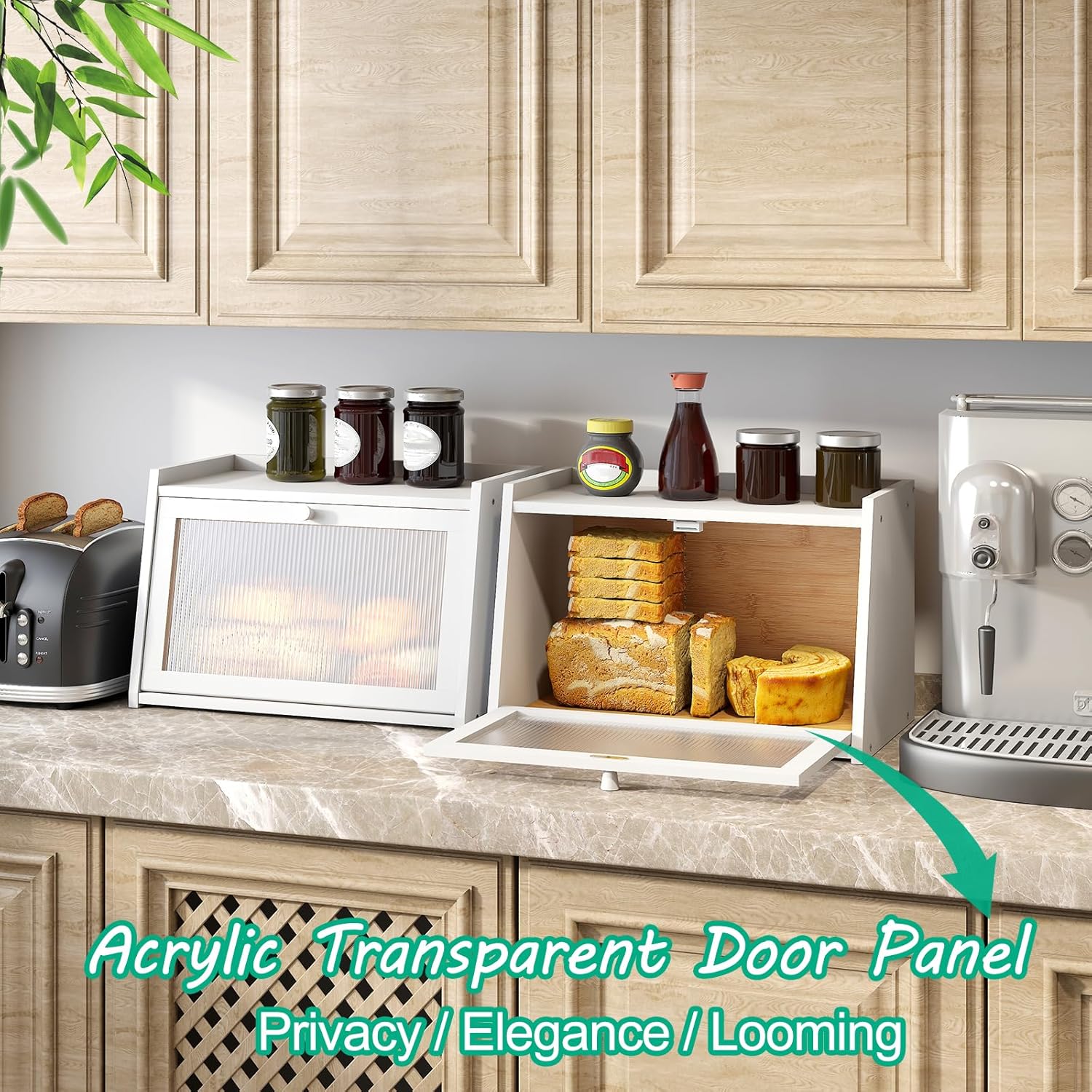 Bread Box for Kitchen Counter, Large Bamboo Bread Storage Container with Wavy Arcylic Door, Bamboo Wooden Farmhouse Bread Box for Your House (White, Medium)