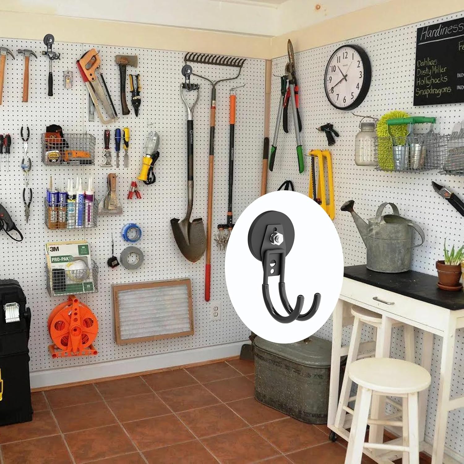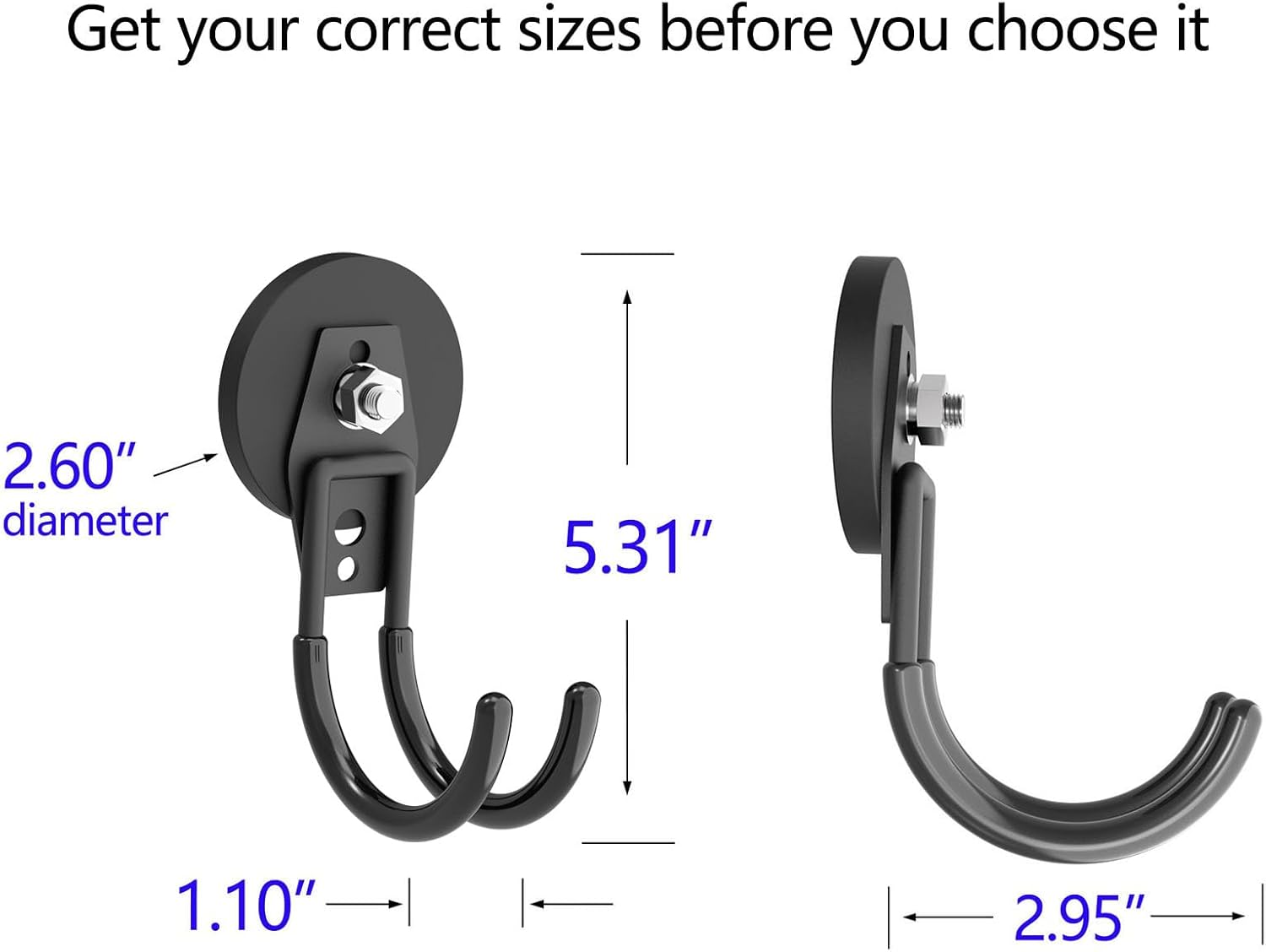 - 🧲[Big Storage Magnet Hooks]: This hook has a strong 2.60-inch magnet base with a threaded bar, nut, spacer, and a coated hook. We tested it, and this large J-shaped magnetic hook can hold EV chargers, two gallons of bottled water, various garage tools, drills, and toolboxes.