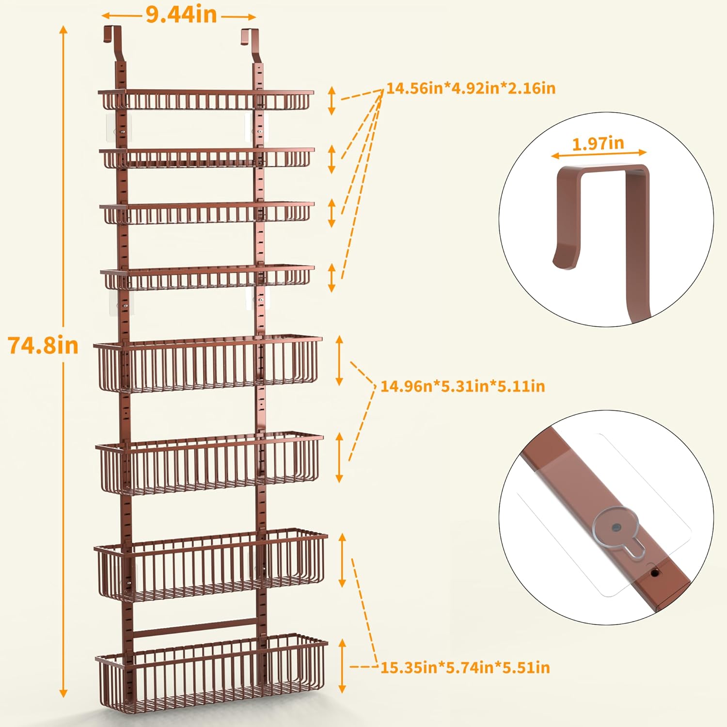 - 【Perfect Size and Load Capacity】Recommended depth for pantry: >6.29 inches, door hooks are 1.97 inches, suitable for the thickness of doors in most rooms, overall dimensions: 74.8 inches high, 16.5 inches wide, , each Rack load is 25 lbs, 8 tiers is 200 lbs. With strong stability, the door organizer can serve you for a long time.