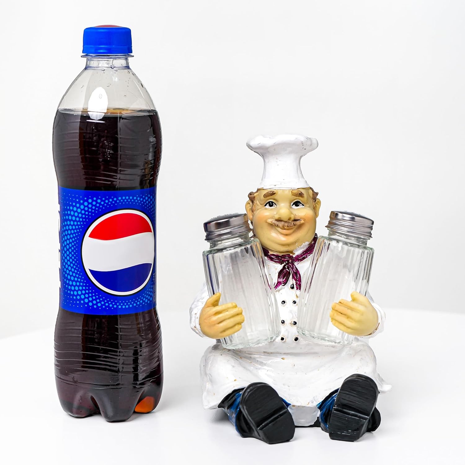 - Novelty Design: Resin chef figurine salt and pepper shakers set featuring a whimsical kitchen decor theme.