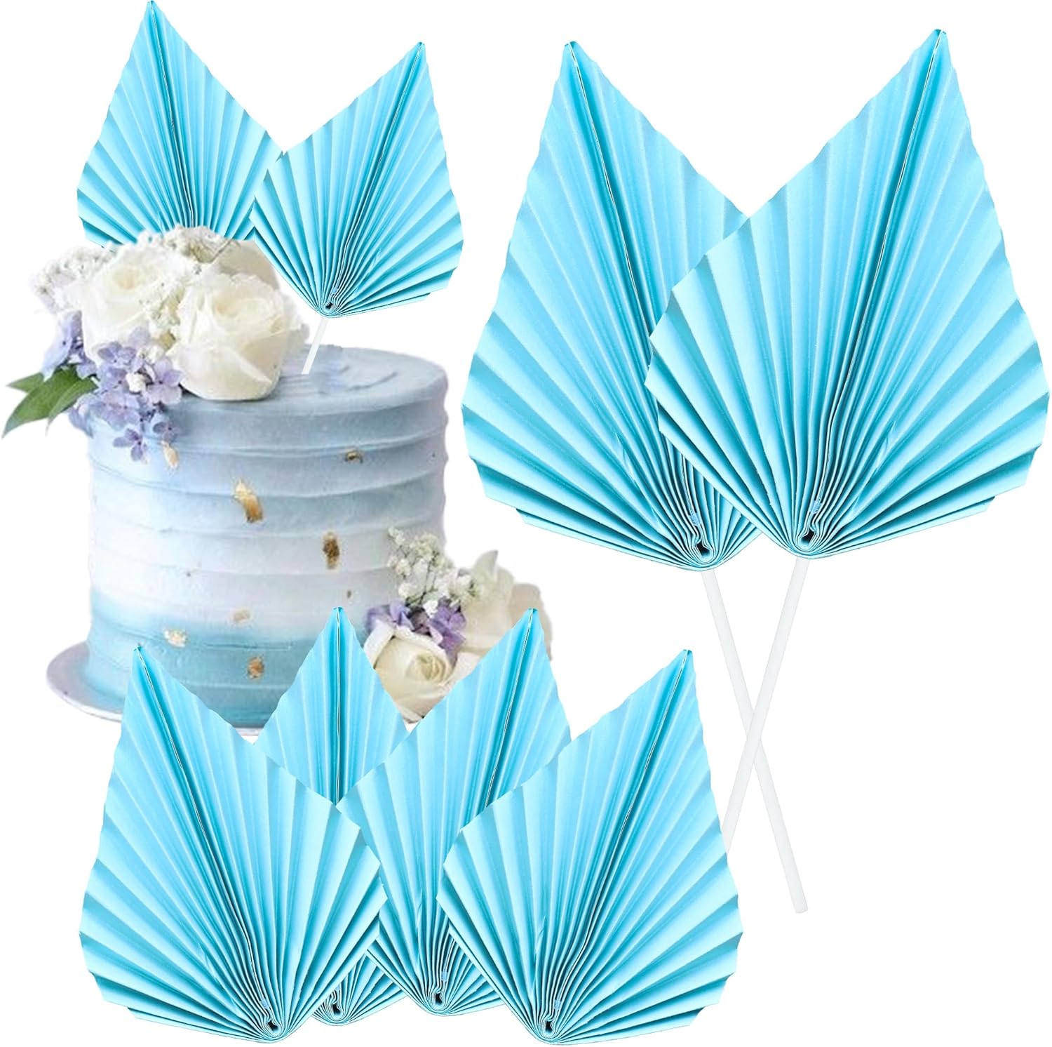 Gyufise 6pcs Paper Palm Fan Cake Toppers - Palm Leaf Fan & Spear Leaf Cupcake Toppers - Cake Insert Decoration for DIY Craft Projects, Home, Wedding, Party Supplies - Lake Blue
