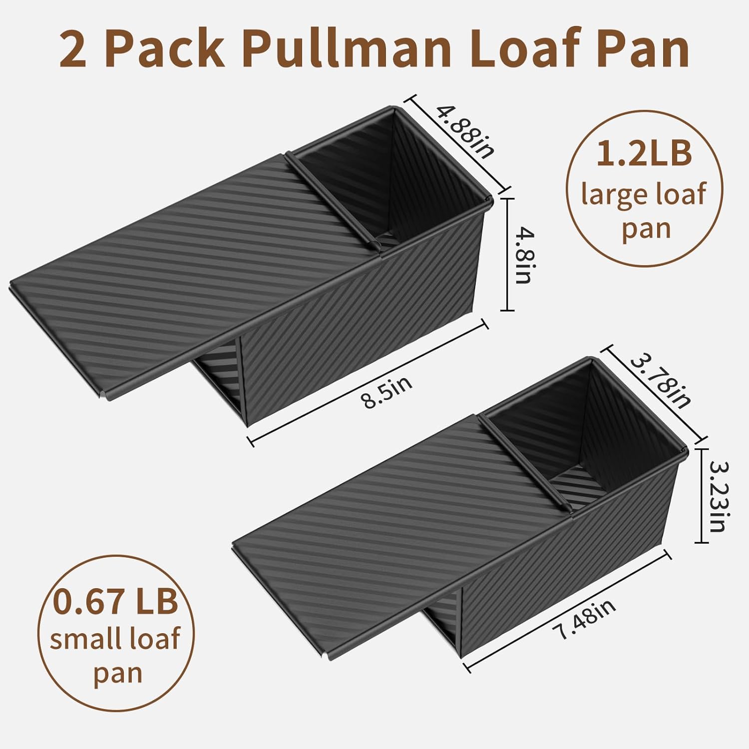 2 PCS Pullman Loaf Pan with Lid, 1.2Lb & 0.67 Lb Dough Capacity Non-Stick Bread Pans for Homemade Bread, Carbon Steel Bread Loaf Pans, Bakeware for Baking Sandwich and Toast, Black
