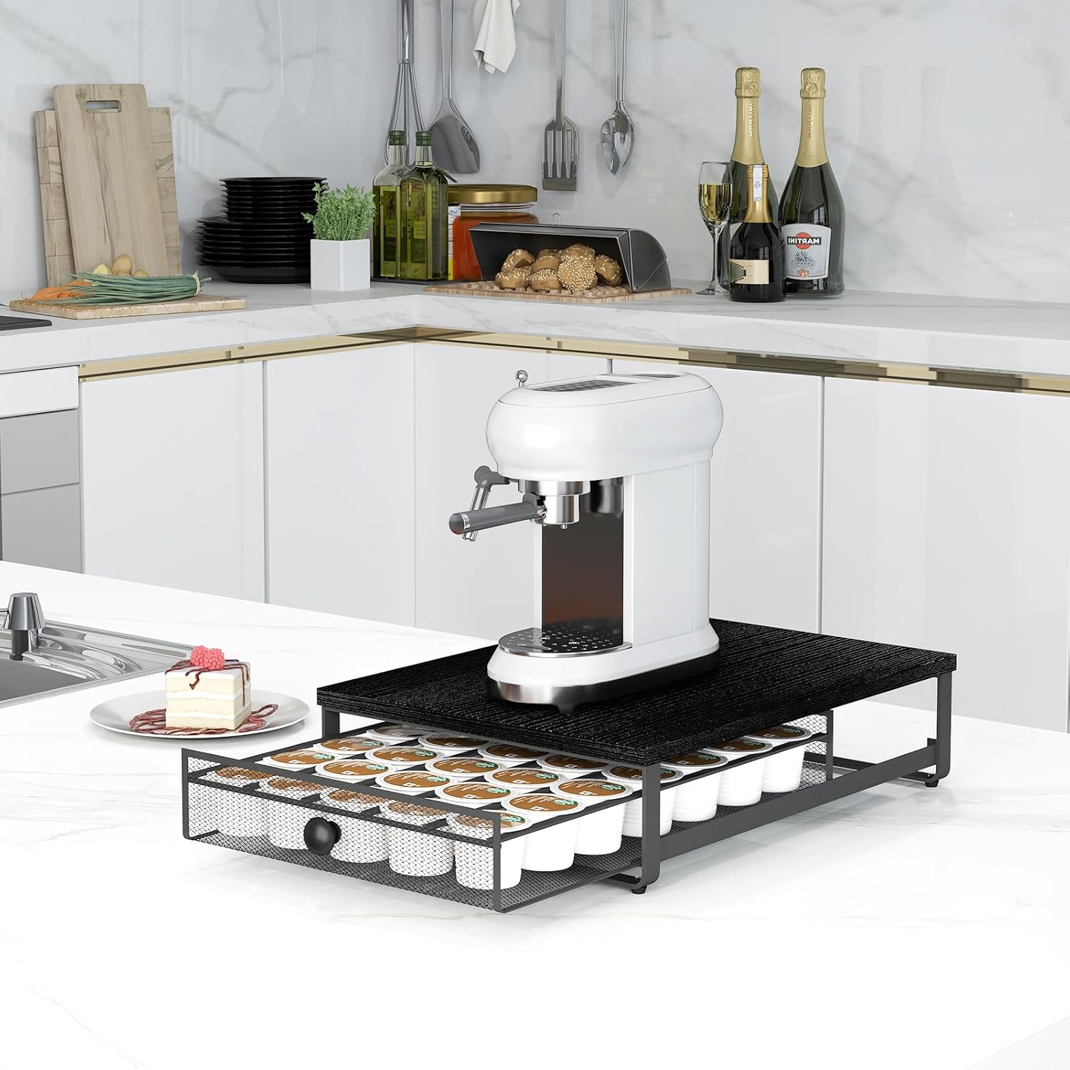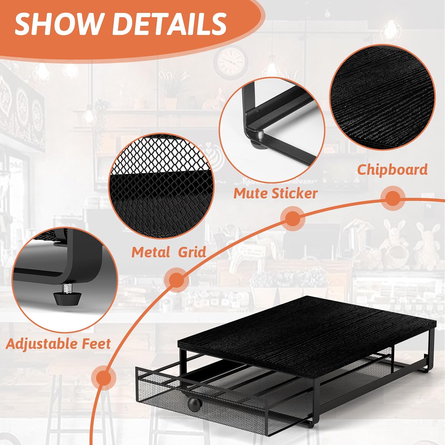 - Premium Materials & Easy Cleaning :The K-Cup Storage Drawer is made from High-Quality Carbon Steel and Durable Particle Board, Preventing Deformation and Ensuring Long-lasting Use. Equipped with Soundproof Pads on the Sliding Rails, the Drawer Opens and Closes Quietly, Avoiding any Noise. The Wood Desktop is Easy to Clean — Just Wipe away any Coffee Spills with a Cloth for a Fresh Look.