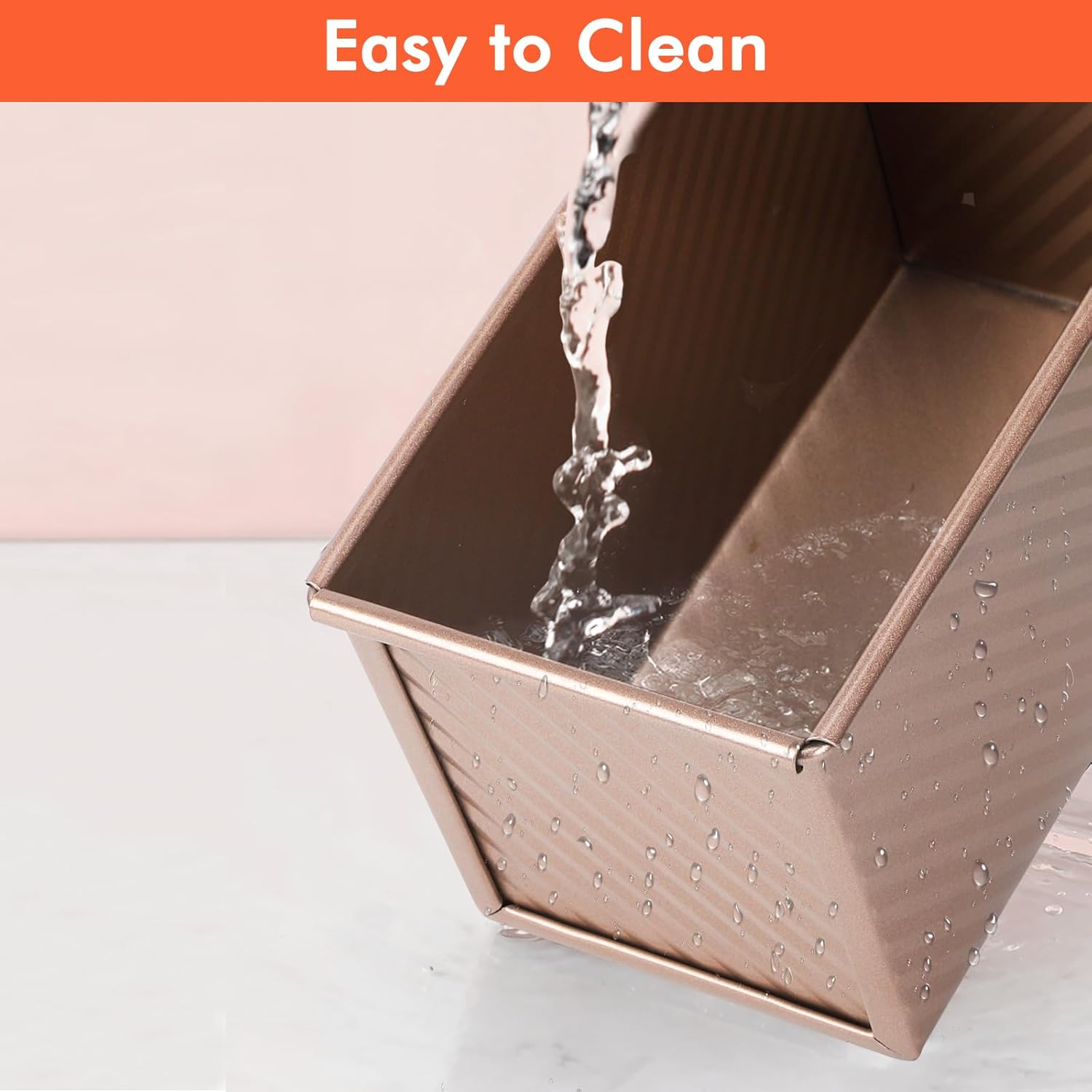 - Non-Stick Coating & Easy to Clean --- The pretty slick nonstick coating on loaf pan which is easy to clean, making the bread dough and baked bread can be removed from it easily. We suggest that spray the pan with some cooking spray before putting dough in it to get the nonstick coating working well. Moreover, be careful with the sharp inner curls and outer corners of the pans while using or cleaning them.
