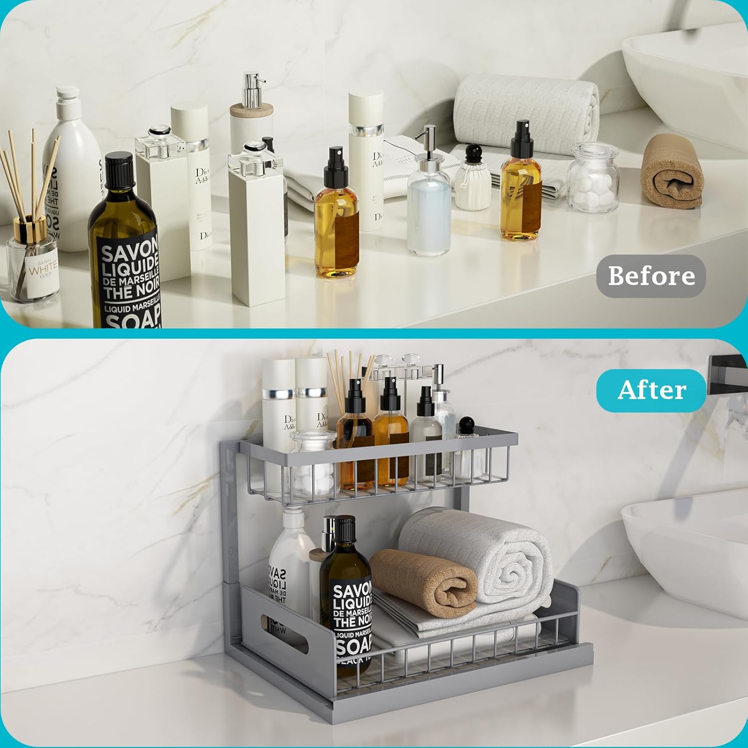 - Sliding Storage Drawer: The under sink organizer is designed as a sliding drawer with handles, can be pulled out smoothly, allowing you to easily access the items stored at the bottom.