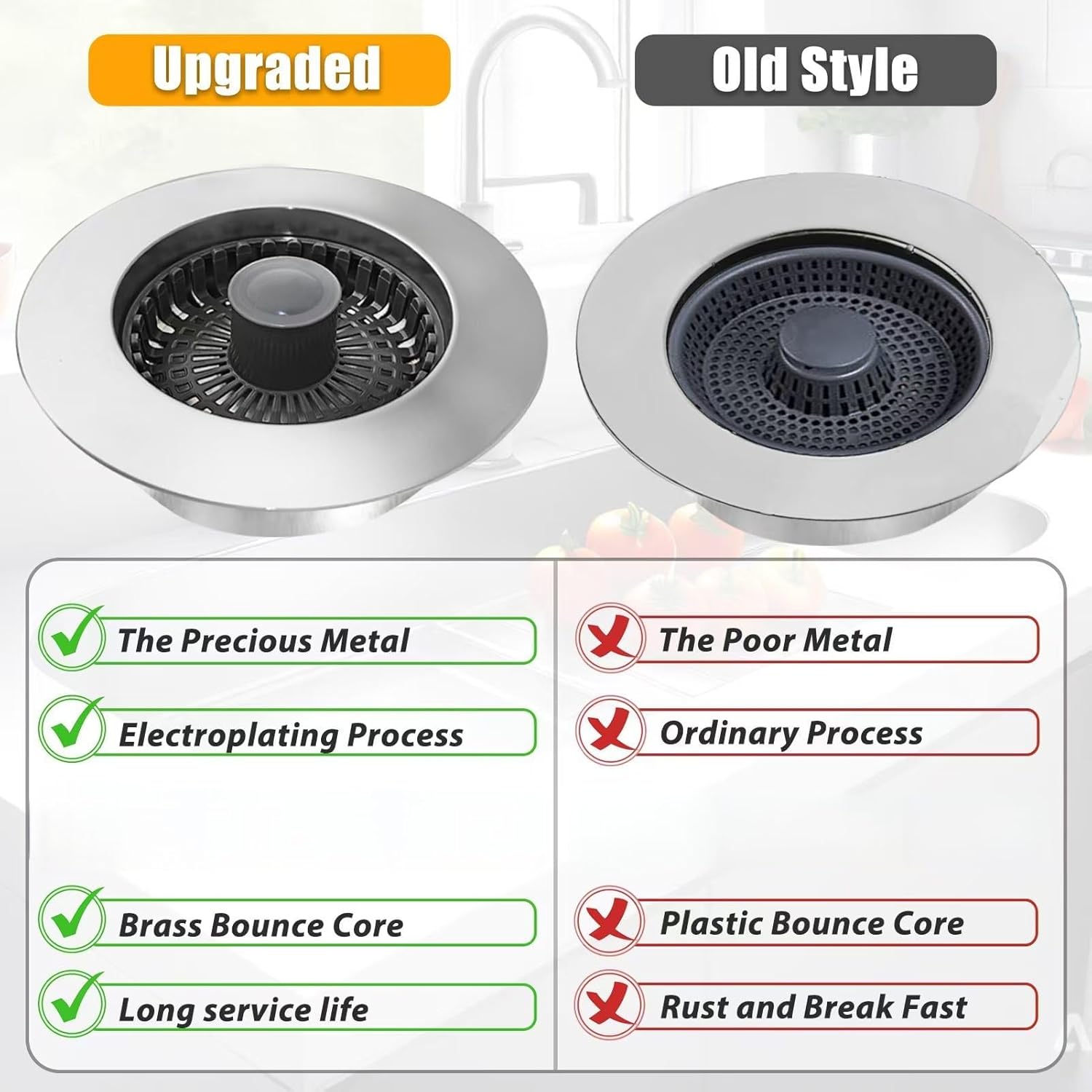 - [ Brass Material ] Sink Drain Strainer, is consists of Brass, electroplating body and ABS material plastic sink strainer basket. (Comes with an additional ABS plastic strainer basket)