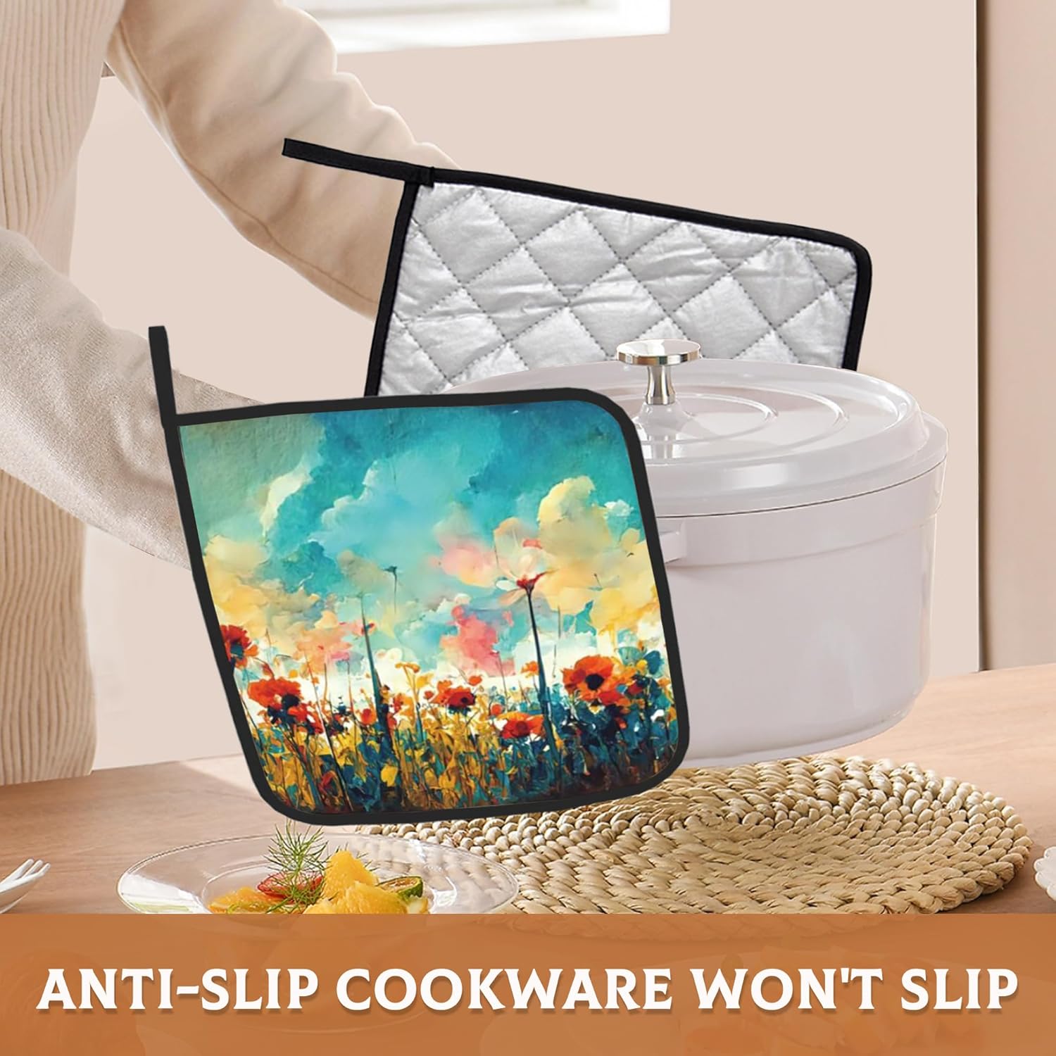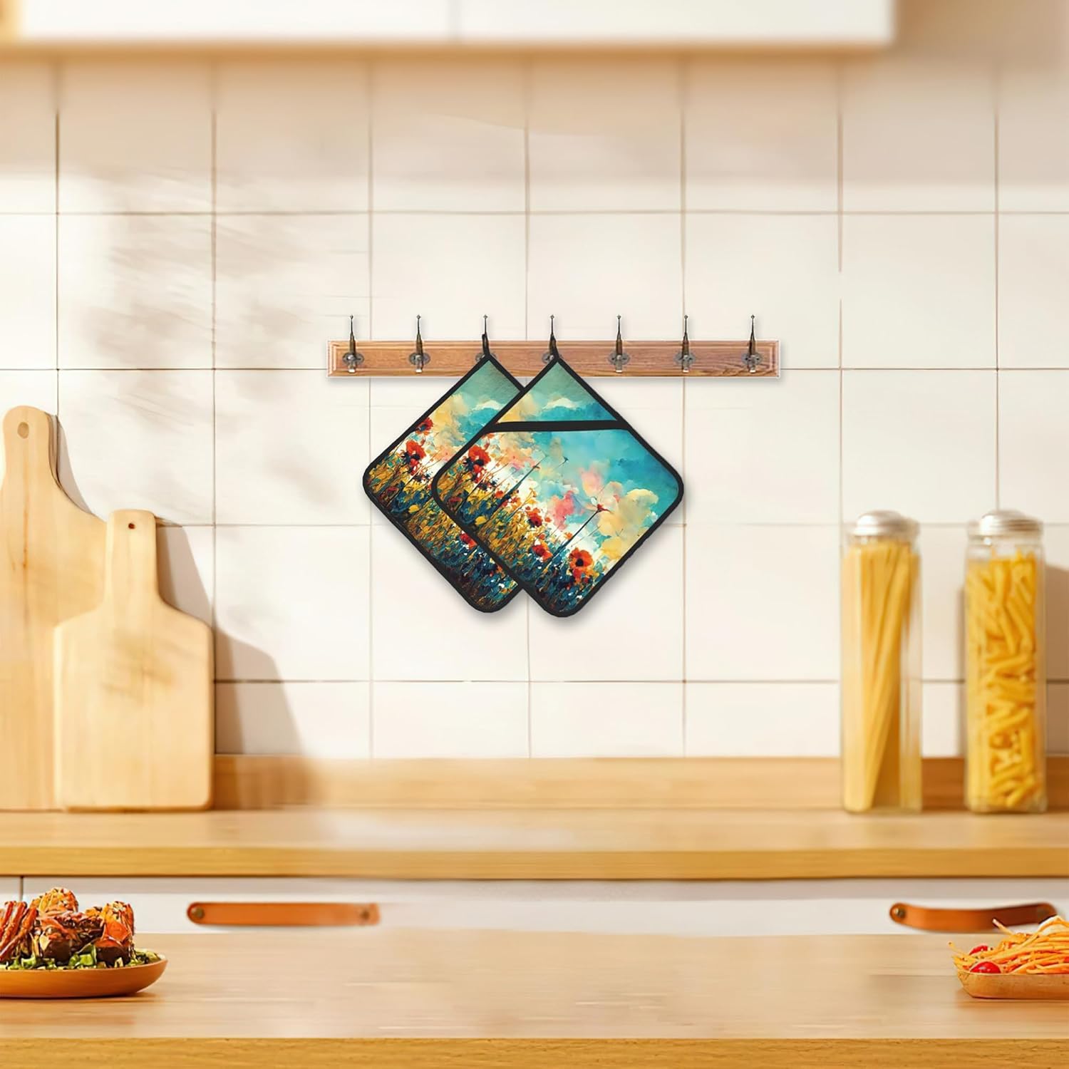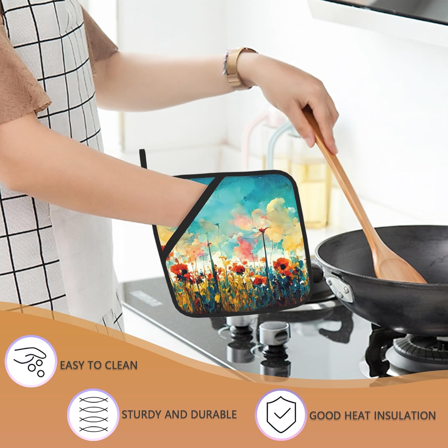 Abstract Red Poppy Flowers Pot Holders Set of 2, Kitchen Heat Resistant Potholder for Microwave Cooking Baking Oven End Dishes and BBQ
