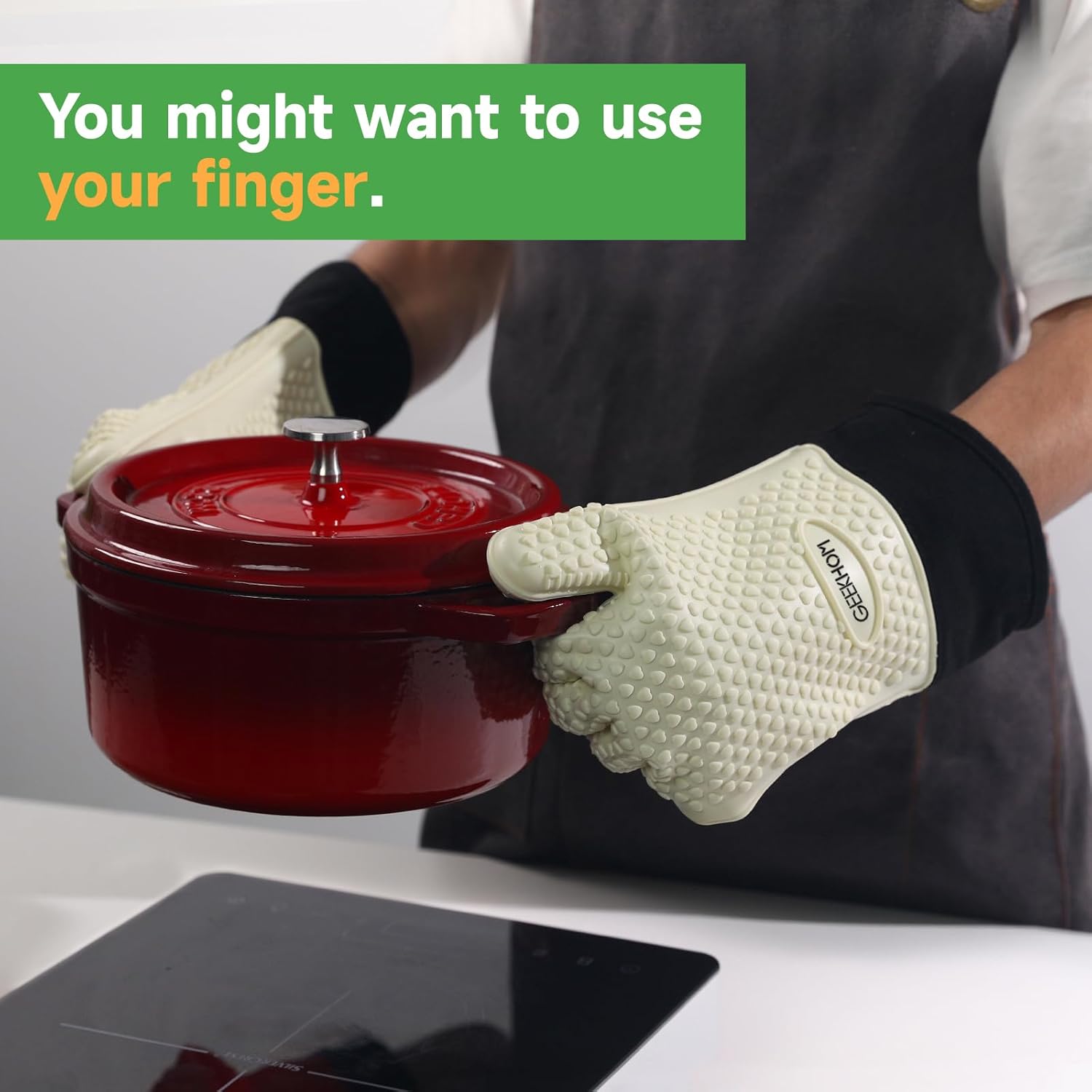 - Unrivaled Heat Defense for Ultimate Safety: Engineered with heat-resistant silicone up to 446°F, our oven mitts protect hands from scorching grill surfaces, boiling pots, and oven racks while maintaining flexibility to flip burgers or adjust smoker vents effortlessly; The 13.7" extended length with 3.17” sleeve shields wrists during outdoor barbecue adventures