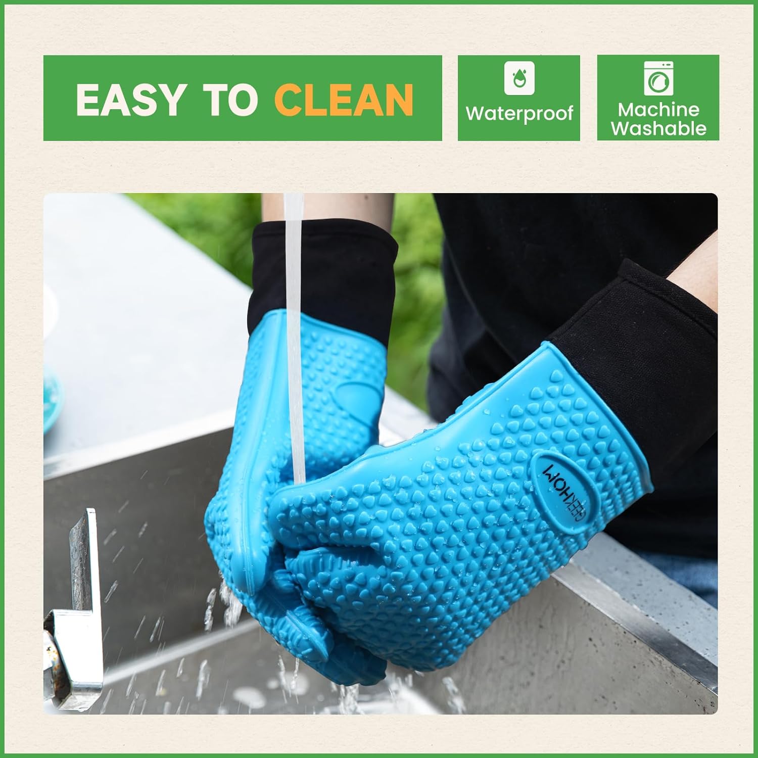 - Effortless Cleanup, Smarter Kitchen Flow: Waterproof silicone repels hot grease and marinade spills, while dishwasher-safe design erases stains in minutes; Hang the oven gloves compactly with the built-in loop—ideal for small kitchen spaces or tossing into camping gear without bulk