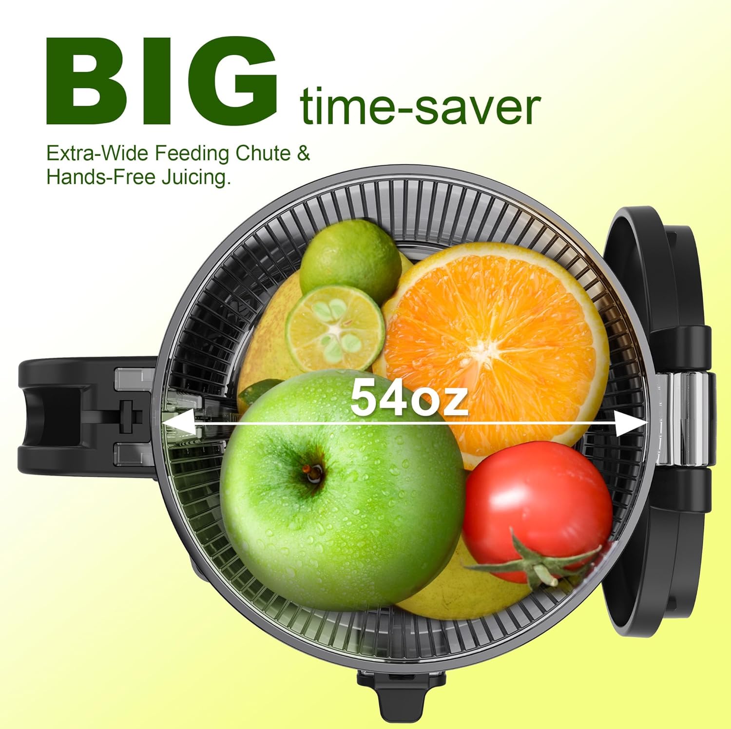 - Extra-Wide 5.3'' Chute & Large 1.8L Hopper: Skip the chopping, Fretta F6000’s extra-wide 5.3'' feed chute fits whole apples, carrots, and other hard produce, saving you prep time. While the 1.8L large self-feeding hopper lets you juice more in one go, perfect for families, healthy lifestyles, or entertaining—just load, press, and enjoy fresh juice faster!