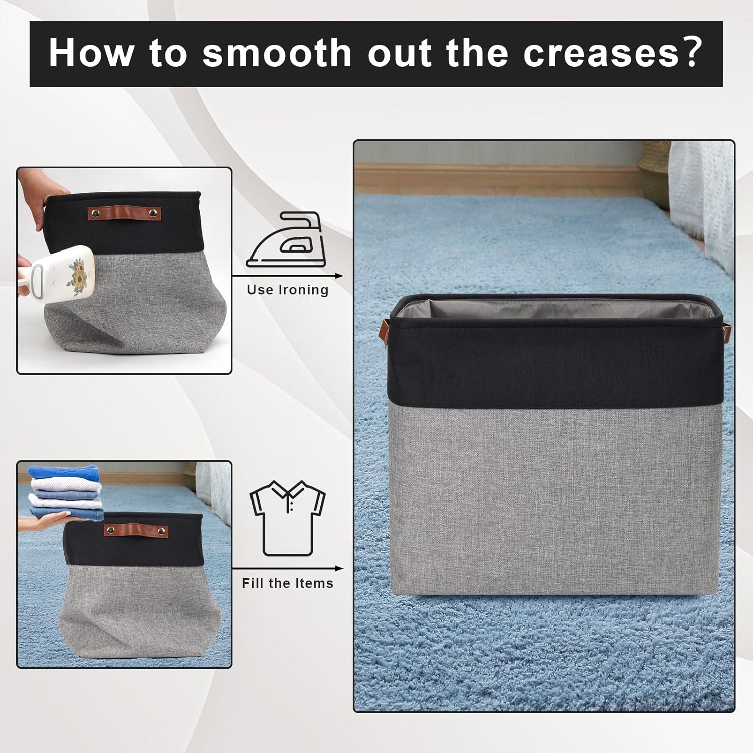 - 【Maintenance & Care Tip】 - Collapsible design for space saving. Our foldable baskets comes in a compression packing which may result in wrinkled storage bin during the long transit. Get rid of the wrinkles by either stuffing the fabric storage bins with blankets and pillows for a few days or steam iron them at low-heat setting. The organization baskets are easy to clean, you can dust the basket with a soft cloth with light soapy water when needed.