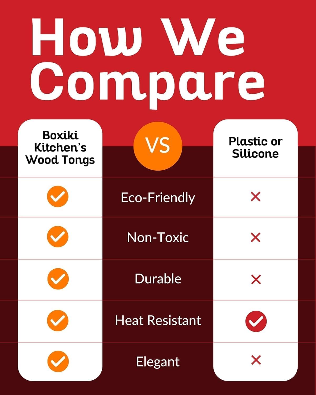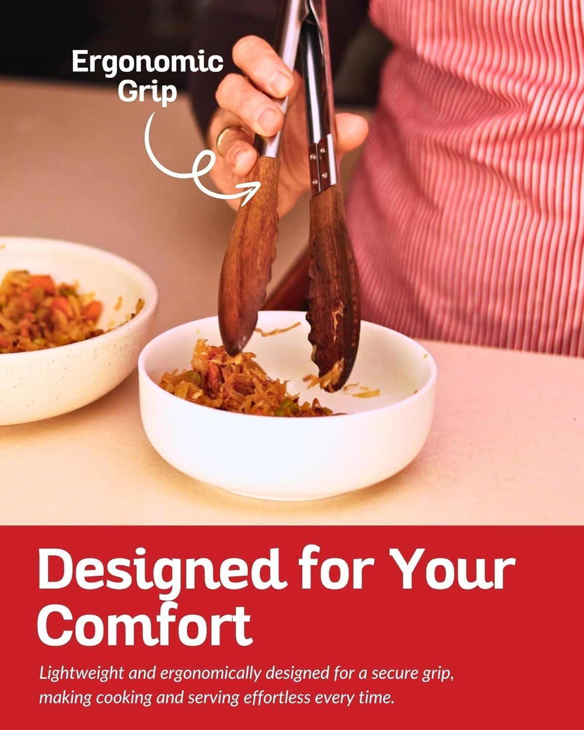 - NON-TOXIC NATURAL WALNUT WOOD: Our wooden tongs for cooking are expertly crafted from natural walnut wood, ensuring a non-toxic and safe experience. These serving tongs are reinforced with stainless steel, offering the durability needed for all your cooking tongs needs.
