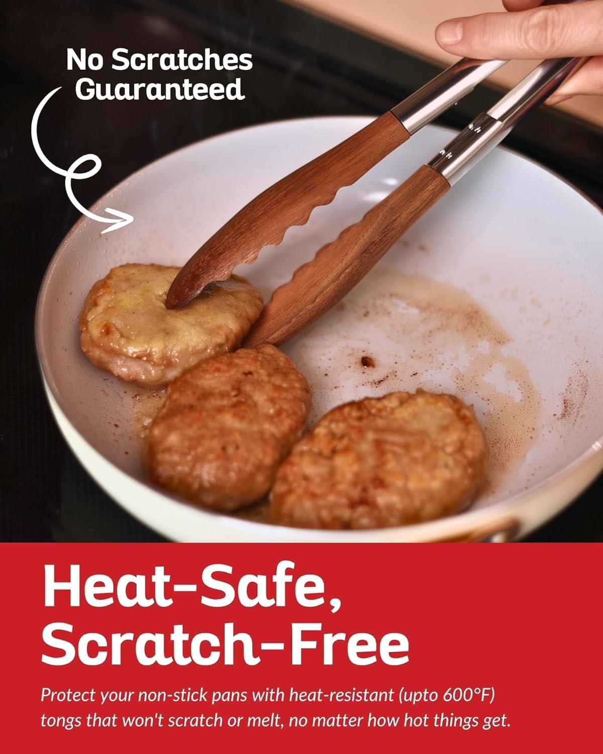 - SCRATCH-RESISTANT: Our tongs for serving food come with wooden tips, ensuring they are gentle on all types of cookware. Wood Tongs, ideal for cooking, grilling, BBQ, and tossing salad, they prevent scratches on non-stick surfaces, making them a safe choice for your favorite pots and pans.