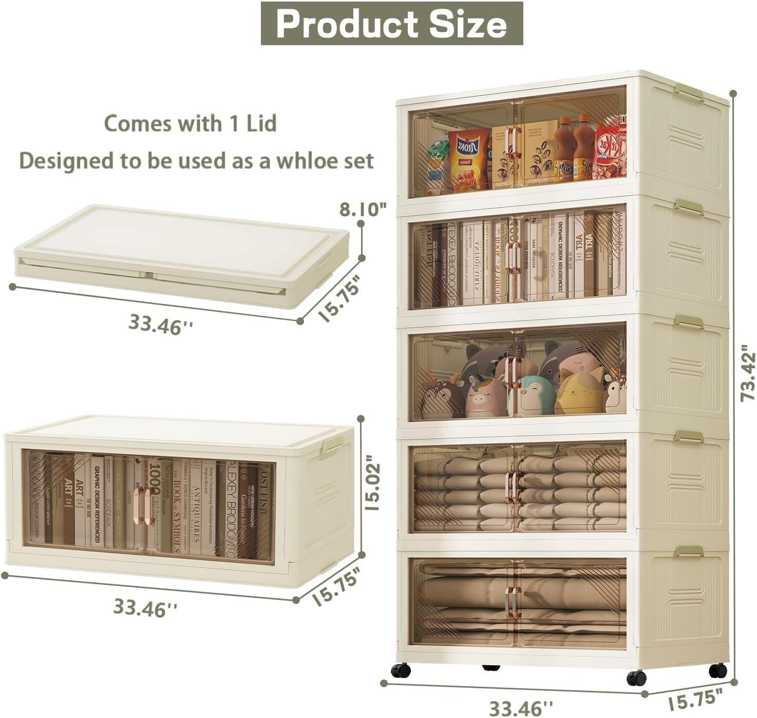 KHNR 5Packs Stackable Storage Bins with Lid, 36 Gal Closet Organizer and Storaging Drawer, Collapsible Storage Box with Wheels, Plastic Clothes Storage Cabinet Containers for Home, Office, Dorm