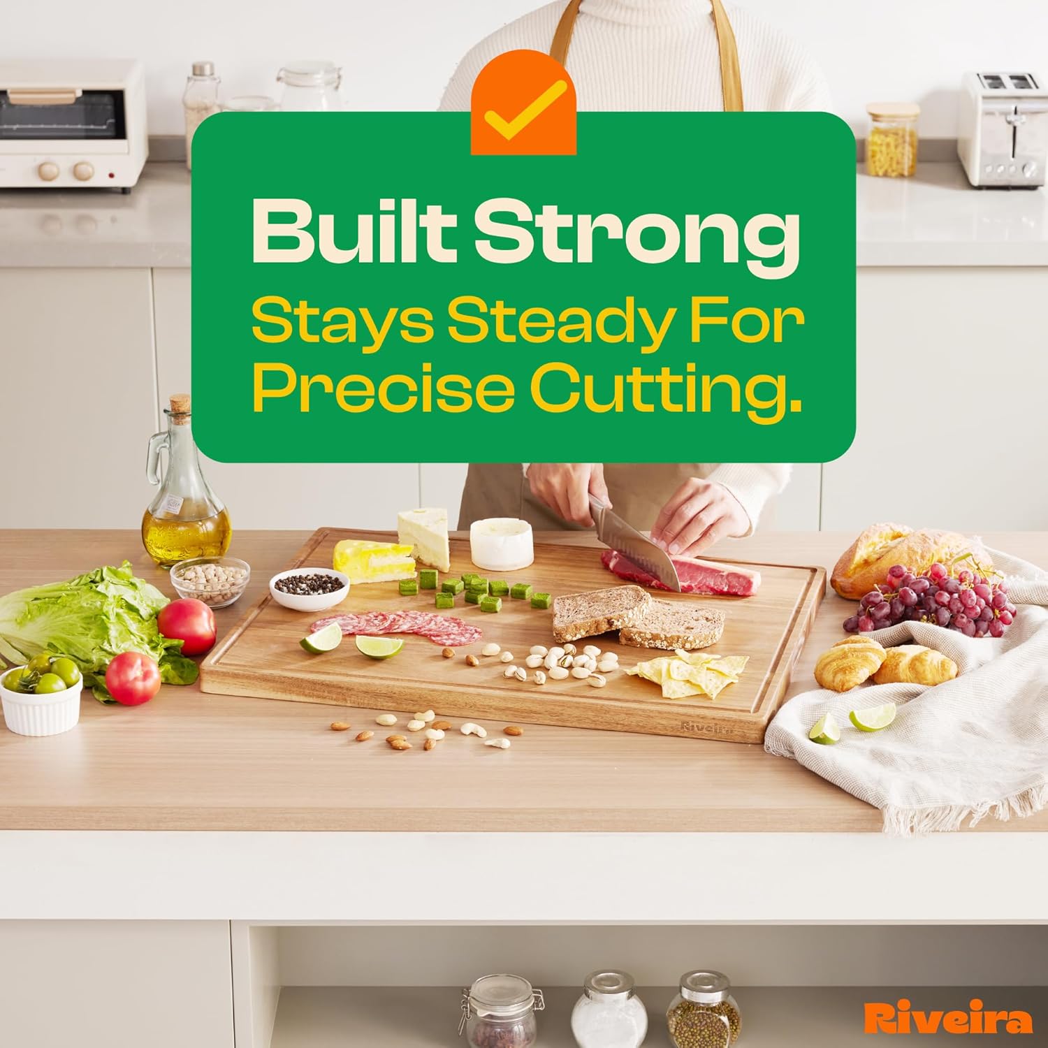 - Premium Crafted Acacia — Take a detour from traditional kitchen aesthetics with this acacia wood board crafted from 100% natural acacia. Beyond being an unconventional and eco-friendly choice, the chopping board wood proudly showcases the environment friendly and organic acacia. This wood cutting boards for kitchen counter adds an unexpected touch of confidence and style to your once-orderly culinary space. Riviera's wooden chopping boards for kitchen will be there for you for many years.