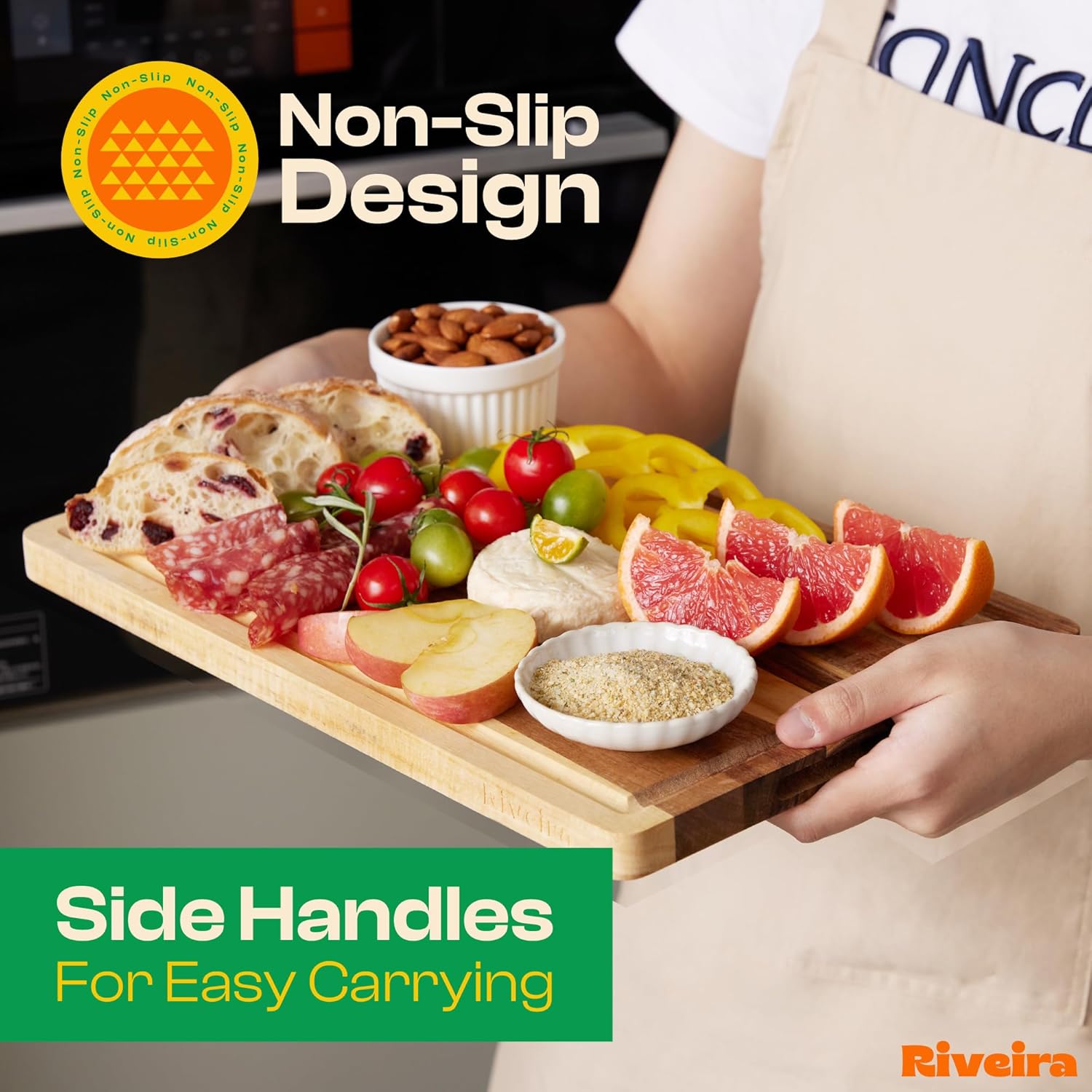 - Handle Everything with Confidence — The built-in handle holds of the acacia charcuterie boards large are designed for handling everything with confidence and easy maneuvering. Pre-oiled and ready for immediate bewilderment, this wood serving board is not just convenient for the kitchen mess but has a unique design to maintain, ensuring a performance that is both comfortable and clean for bread boards wooden. Riviera big wooden cutting board will be perfect in your kitchen.