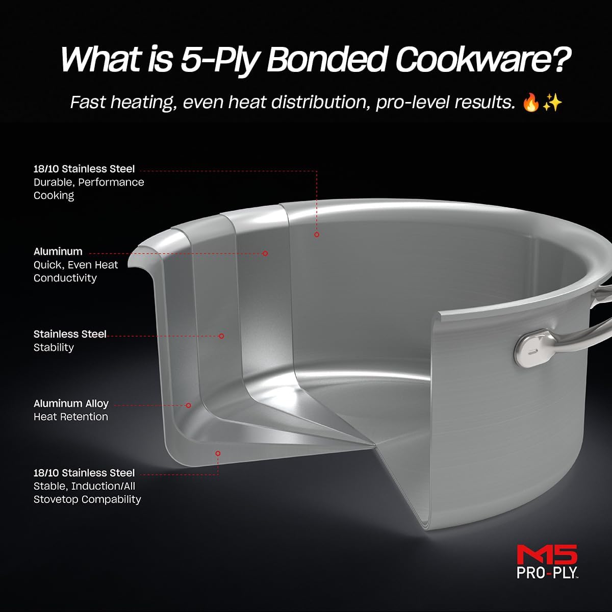 - 5-LAYER BONDED CONSTRUCTION: Delivers fast, even heating with no hot spots—so your food cooks more evenly every time. Made with premium 18/10 stainless steel and a 3-layer aluminum core for long-lasting performance. The 2.5mm thick body retains heat better and resists warping, even under high heat.
