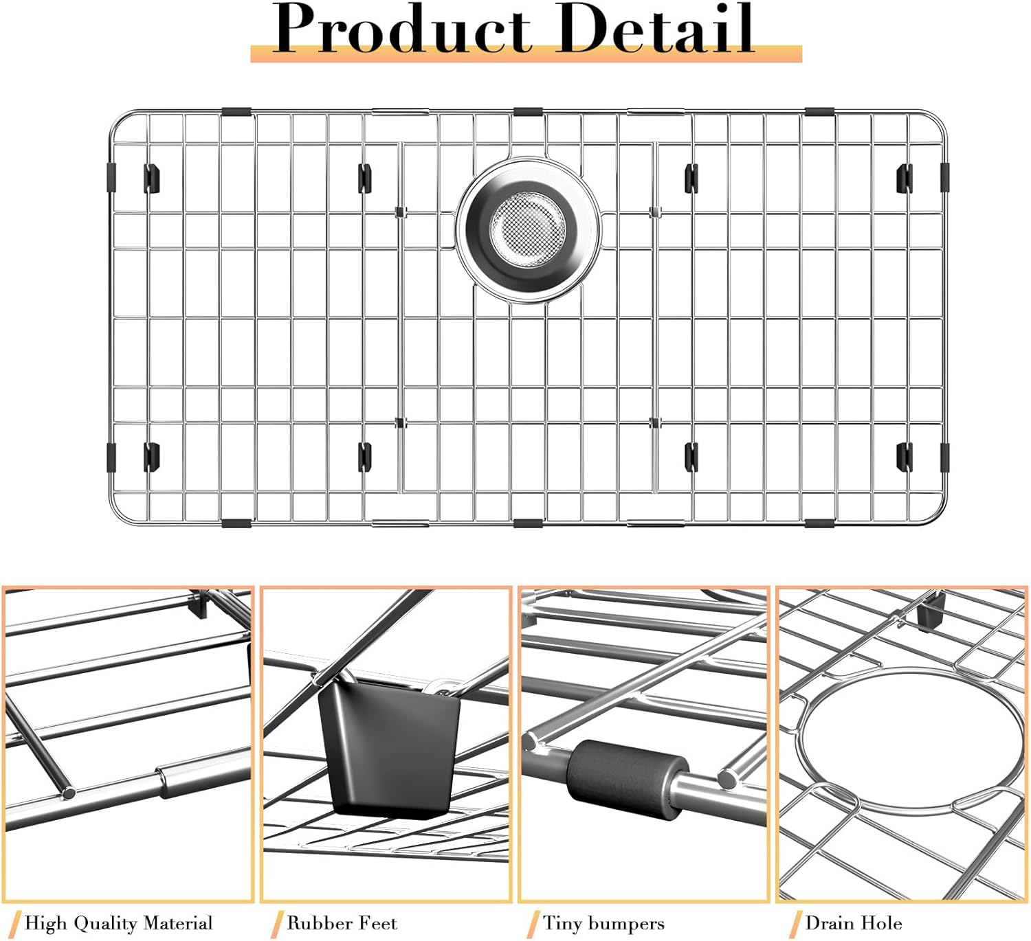 28-7/8’’ x 14-3/8’’ Stainless Steel Sink Protector, Sink Protectors for Kitchen Sink, Sink Grid, Sink Grate for Bottom with Rear Drain, Metal Sink Rack for Bottom of Sink with Corner Radius