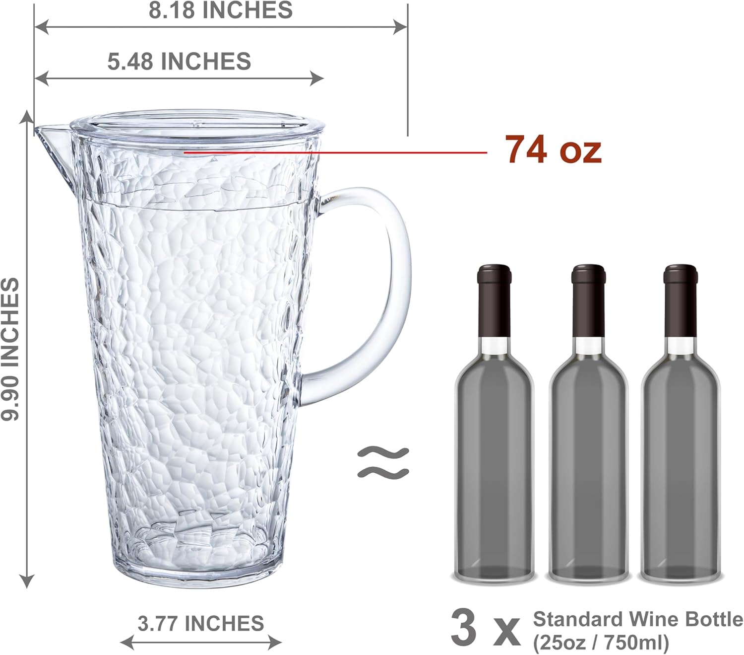 - Durable Hammered Glass-Style Design: Crafted from BPA-free and lead-free plastic, this water jug offers the delicate appearance of hammered glass with the resilience of plastic. Enjoy the elegance of glass without the worry of breakage, making it perfect for both indoor and outdoor use.