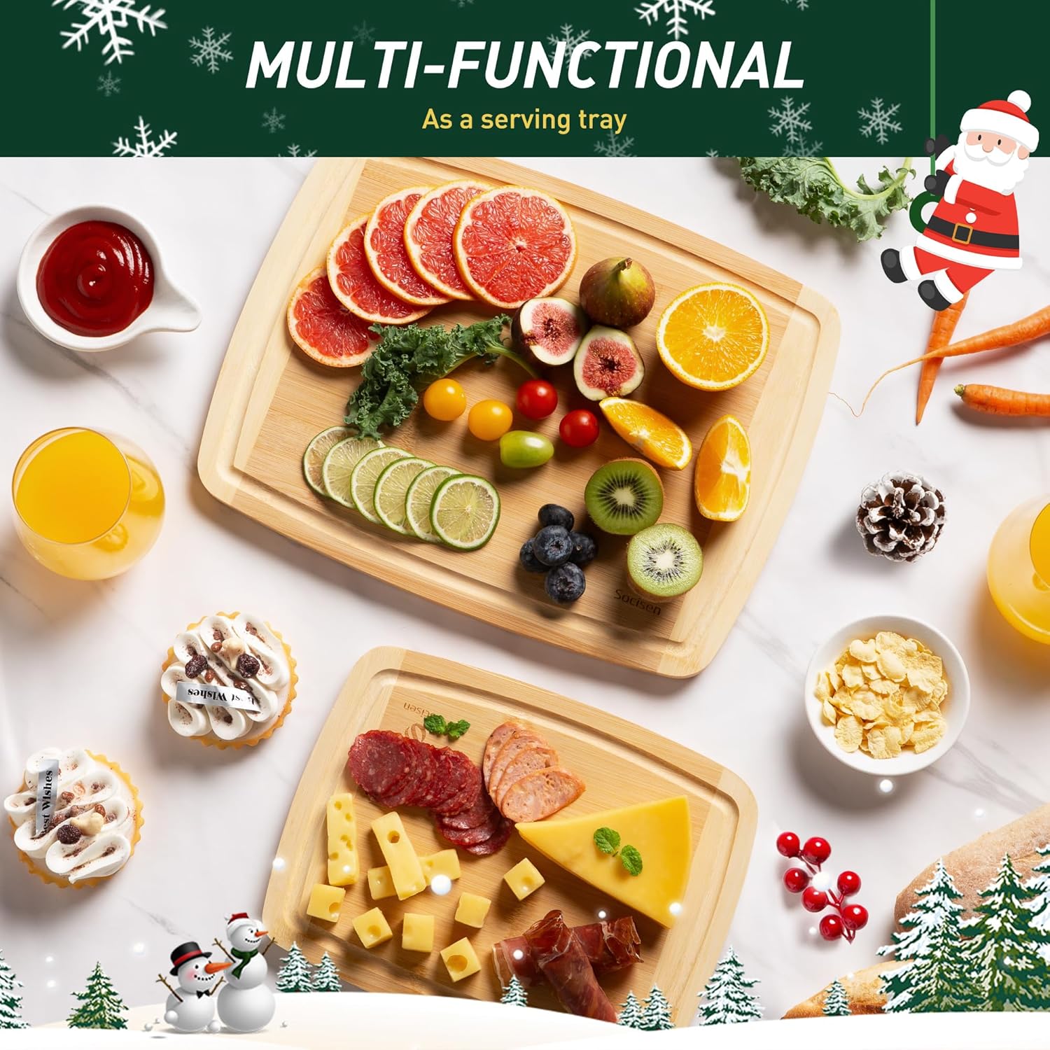 - Thoughtful Design with Handles and Juice Grooves: For effortless transportation and added convenience, our bamboo cutting board feature built-in handles on the sides, allowing you to move your cutting station with ease. The deep juice grooves around the edges catch excess liquids from meats and fruits, keeping your countertop clean and tidy. These thoughtful design elements make our wood board not only functional but also a breeze to clean up, ensuring a neat and tidy kitchen space.