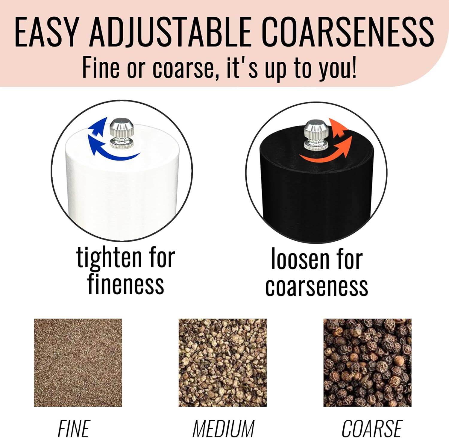 - ADJUSTABLE COARSENESS - Our twist salt pepper grinder set has an adjustable ceramic grinder head. Simply Twist the Top Knob to adjust to your preference. Tighten for Fine Spices and Loosen for Coarse Spices.