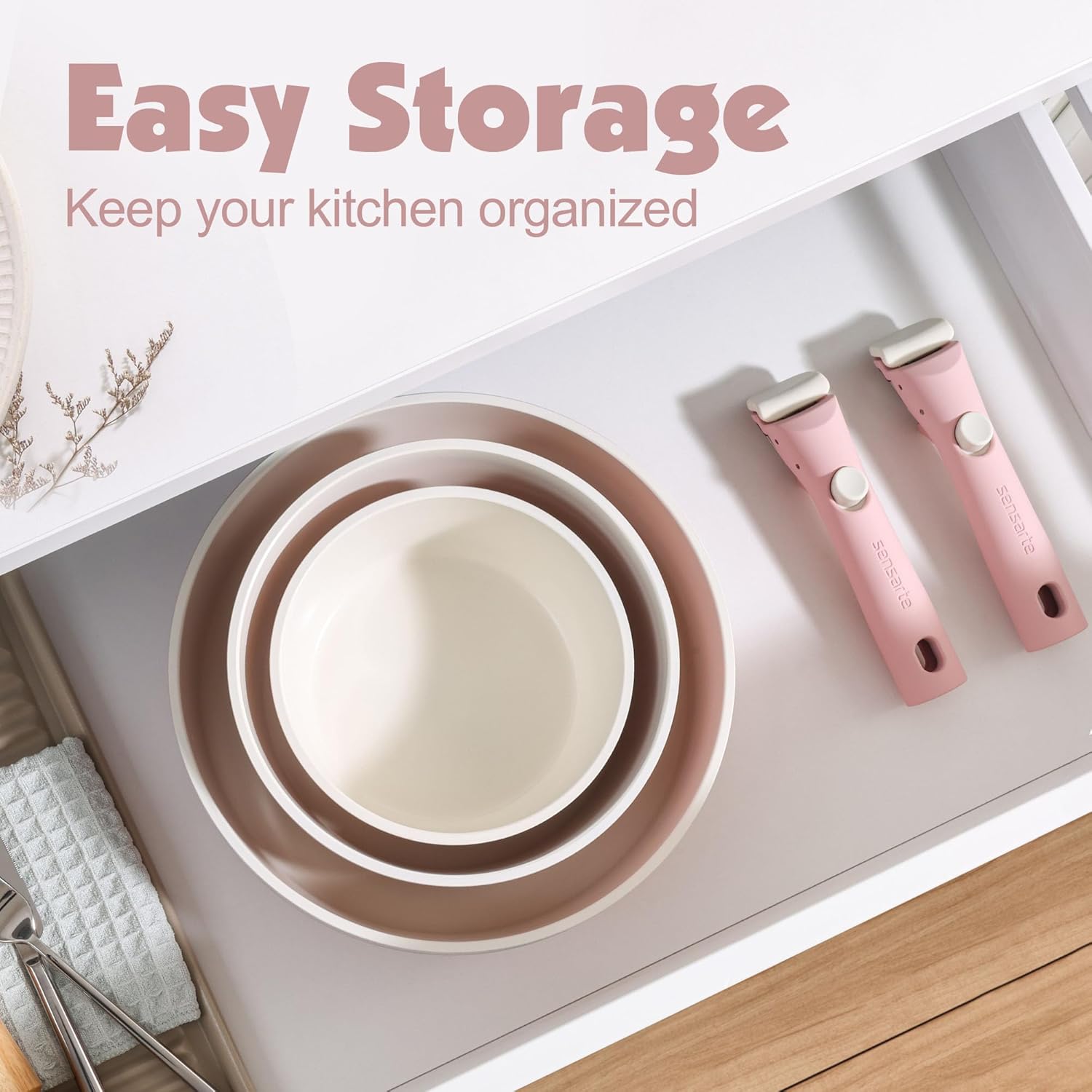 SENSARTE 17 Piece Ceramic Pots and Pans Set, Nonstick Detachable Handle Cookware, Induction Kitchen Cookware Set with Removable Handle, Dishwasher & Oven Safe (Pink)