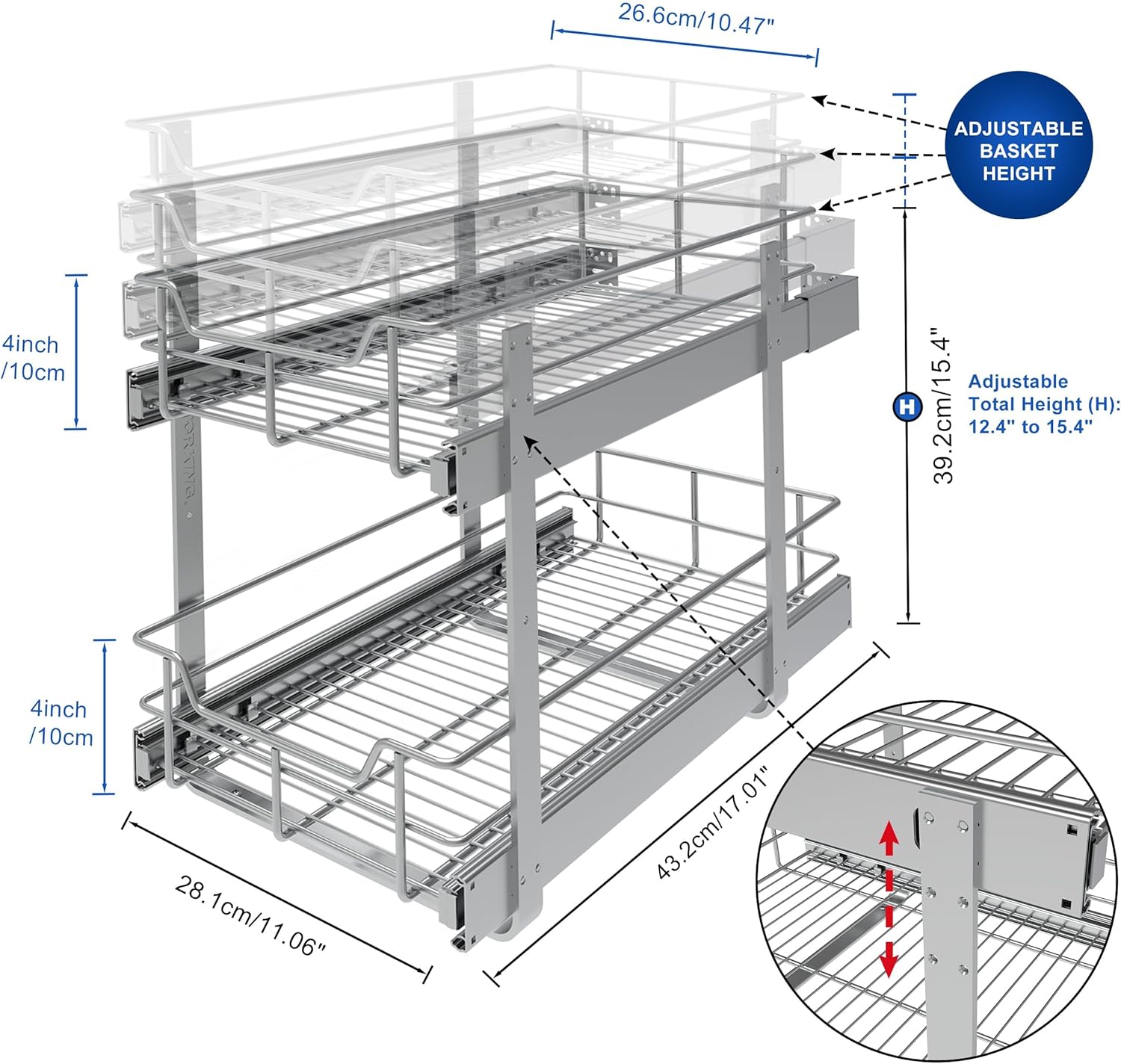 - Durable High Strength Reliable: Wire mesh made of high quality steel, underneath each drawer with 3 cross bars for supporting the heavy weight, even under the weight of heavy portable equipment this wire basket slide shelf will not sagging and bending. Industrial grade ball sliding system make our cabinet pull out shelve can handle up to 100 lbs. The chrome finish on the pull out organizer makes them increase hardness, wear resistance, corrosion resistance, and easy to clean.