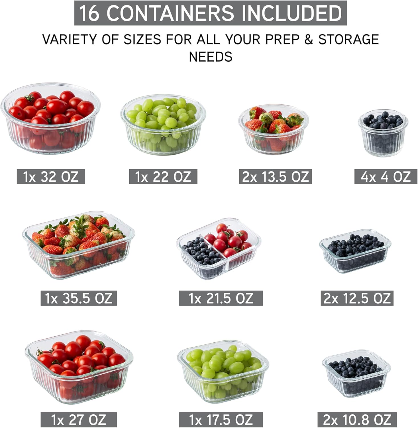- Versatile 32-Pc. Glass Food Container Set: Includes 4 rectangular, 8 round, and 4 square containers, providing a variety of sizes and shapes for all your meal prep and storage needs.