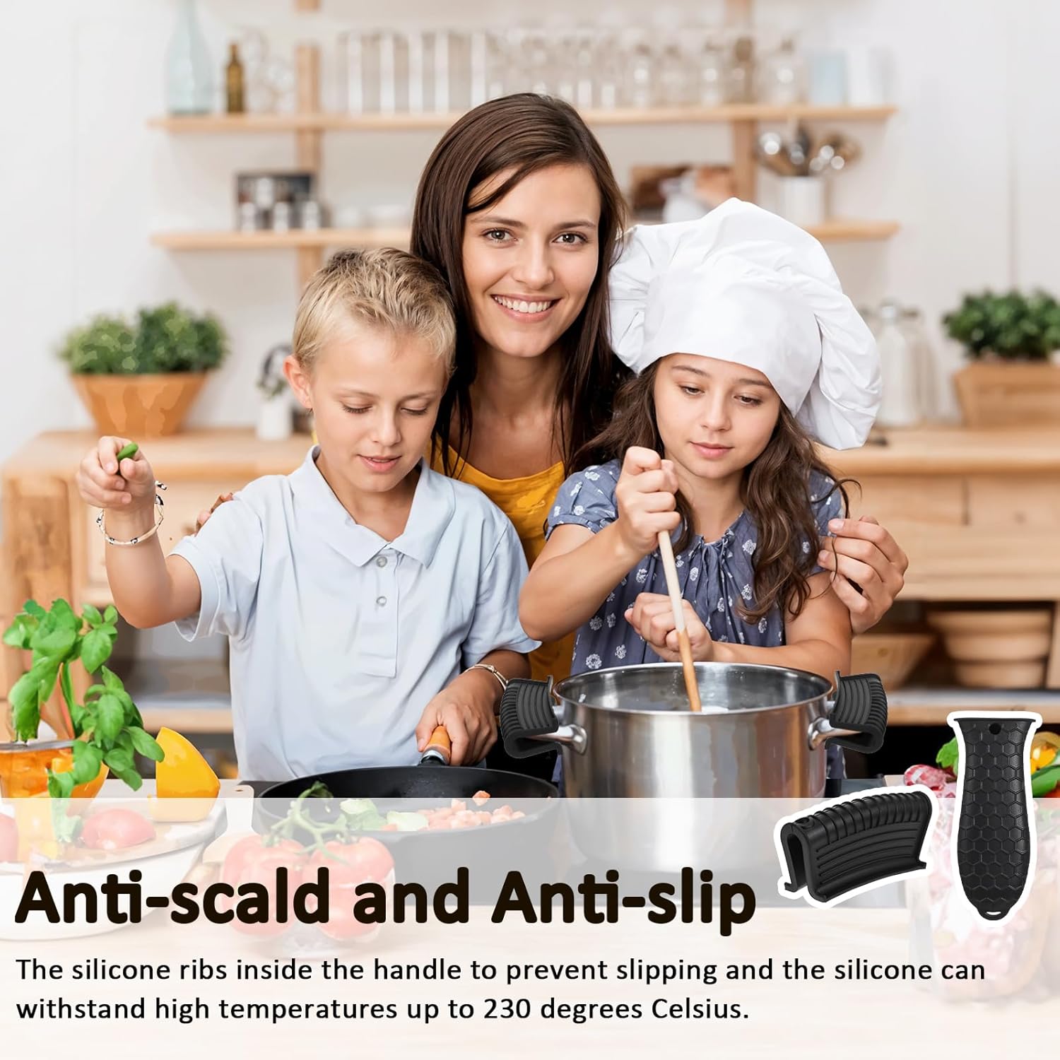 - Heat-Resistant Silicone: Our pot handle holders are made from sturdy, heat-resistant silicone that can withstand temperatures up to 230°C. These handles are essential in the kitchen, protecting your hands from burns when picking up hot cookware