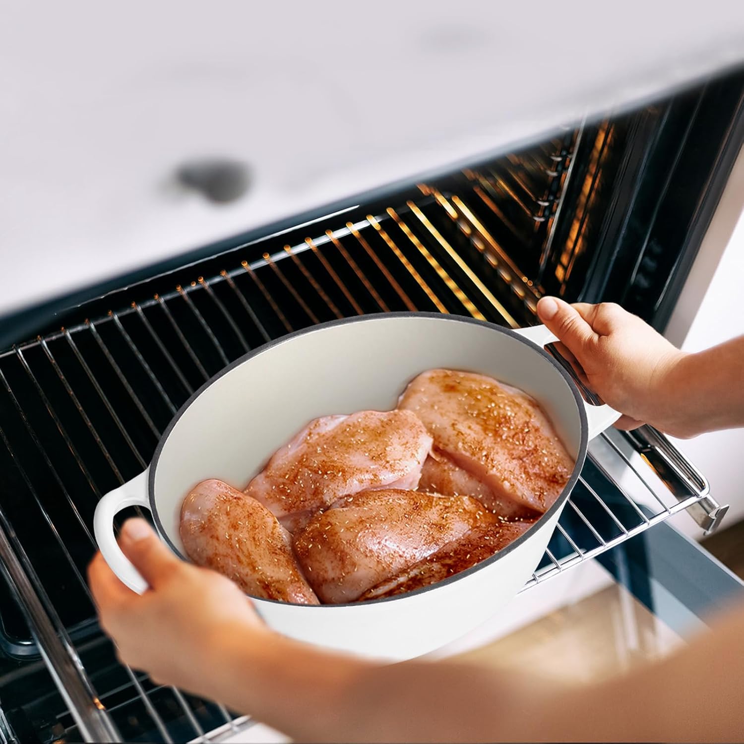 - Superior Heat Retention, our Dutch oven for bread baking ensure even heat distribution and retention, evenly heating throughout both the bottom and sidewalls, oval Dutch oven also reduces the amount of energy needed for cooking, ensuring perfect roasts, stews and baked bread every time. Oven Safe up to 500℉