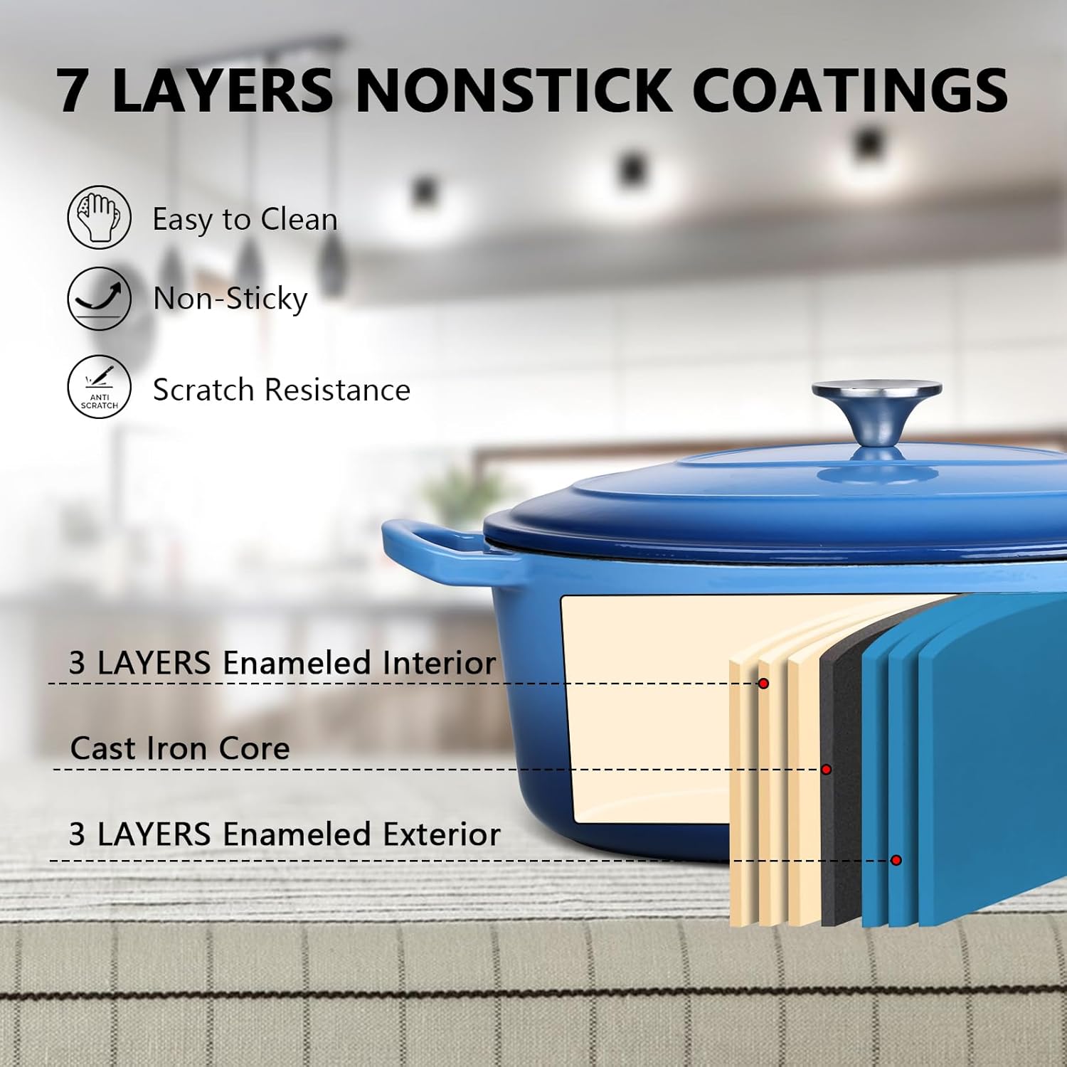 - Heavy Duty Material, Dutch oven pot with lid is made of 6 layers enamel and cast iron core layer, 4mm thickness pot wall with one-piece molding design enhance the strong construction without cracks or chips, high gloss enamel surface with no chemicals, form a layer of smooth coating to keep away from rusting and reduce food sticking
