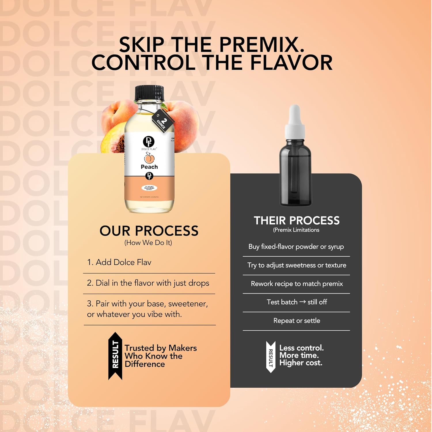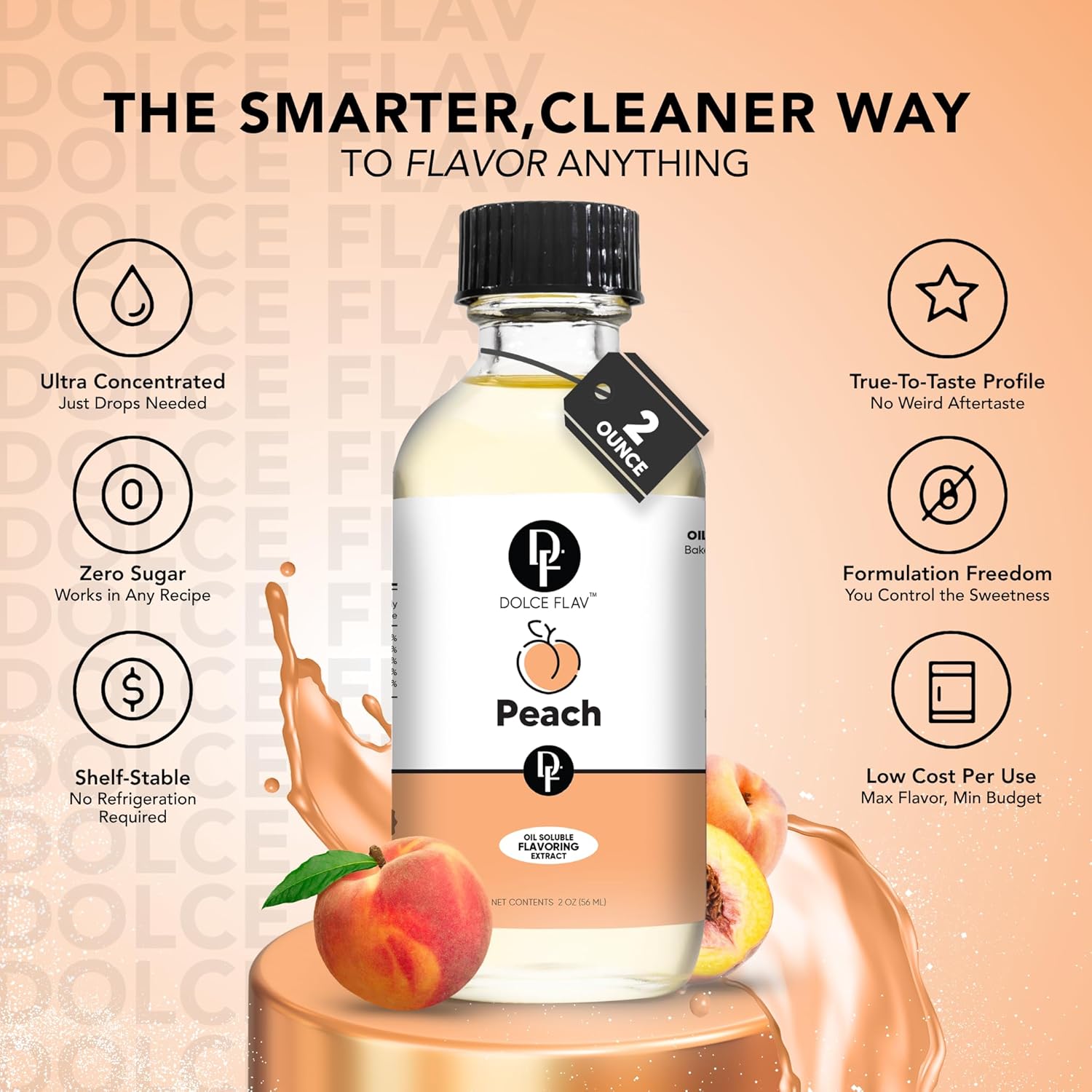 Dolce Flav Peach Extract – 2 Ounce Oil-Soluble Kosher, Sugar-Free, Concentrated Juicy Peach Flavoring for Baking, Chocolates & Desserts, Includes Measured Dropper