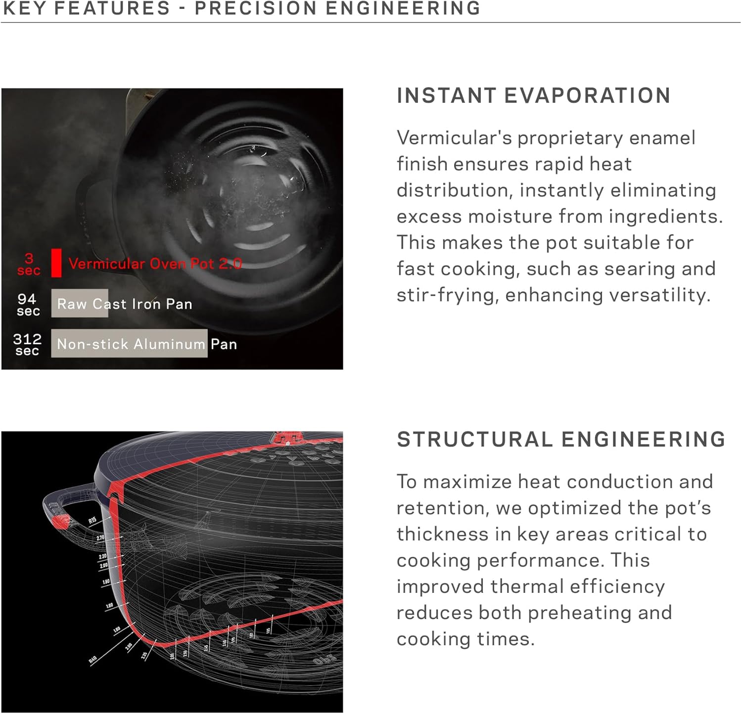- Instant Evaporation: With Vermicular’s proprietary enamel coating, the pot quickly eliminates surface moisture, making the pot ideal for fast cooking methods like searing, stir-frying, and steam-roasting.