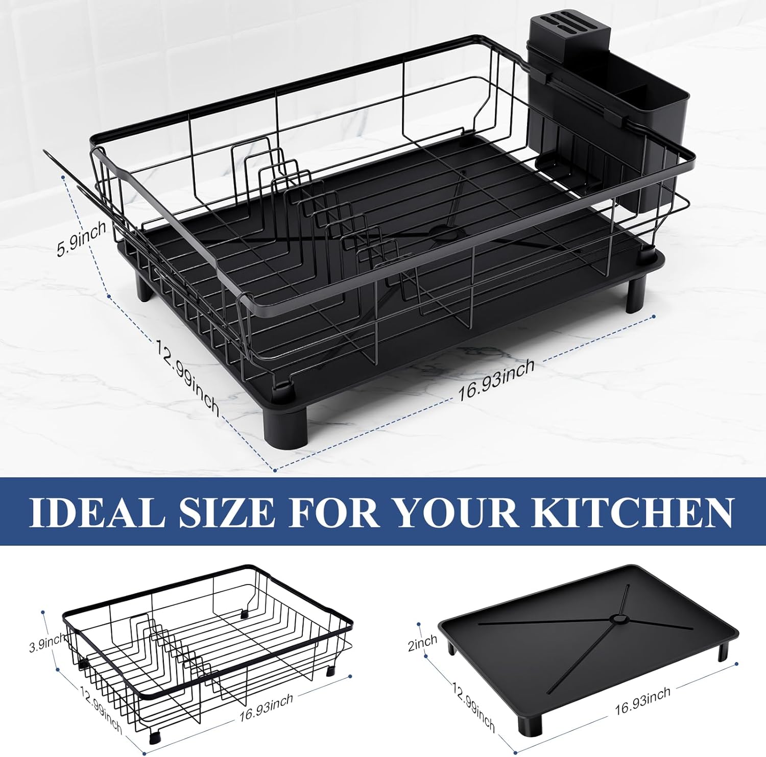 Homaxy Dish Drying Rack for Kitchen Counter (16.93''L x 12.99''W), Space-Saving Dish Drainer Rack Set with Drainboard, Large Dish Rack with Utensil Holder, Cup Rack and Knife Slots, Black