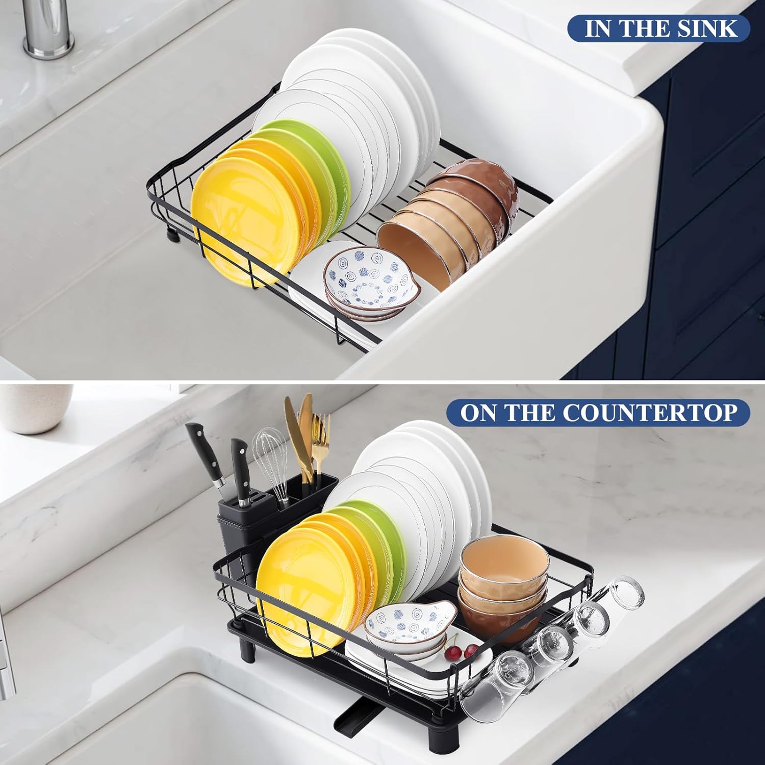 - FAST AUTO-DRAINAGE: The dish drying rack features a slanted drainboard with a central hole and piston, along with grooved channels for efficient and rapid drainage. It’s also equipped with an extendable and 360° rotatable spout allowing it to perfectly fit different kitchen sink
