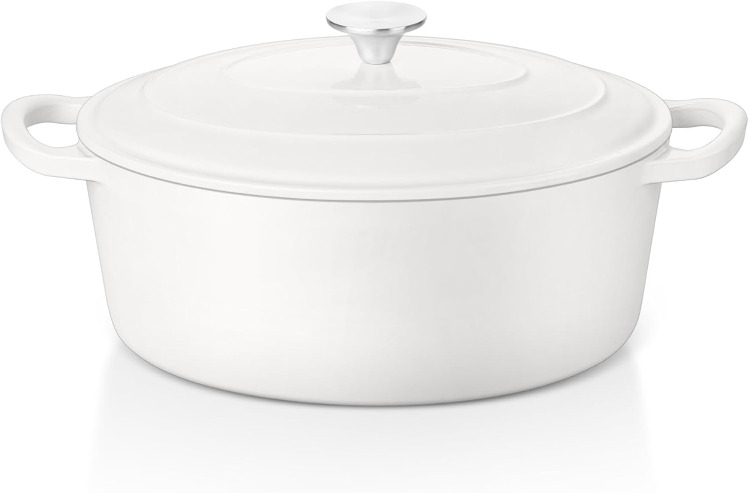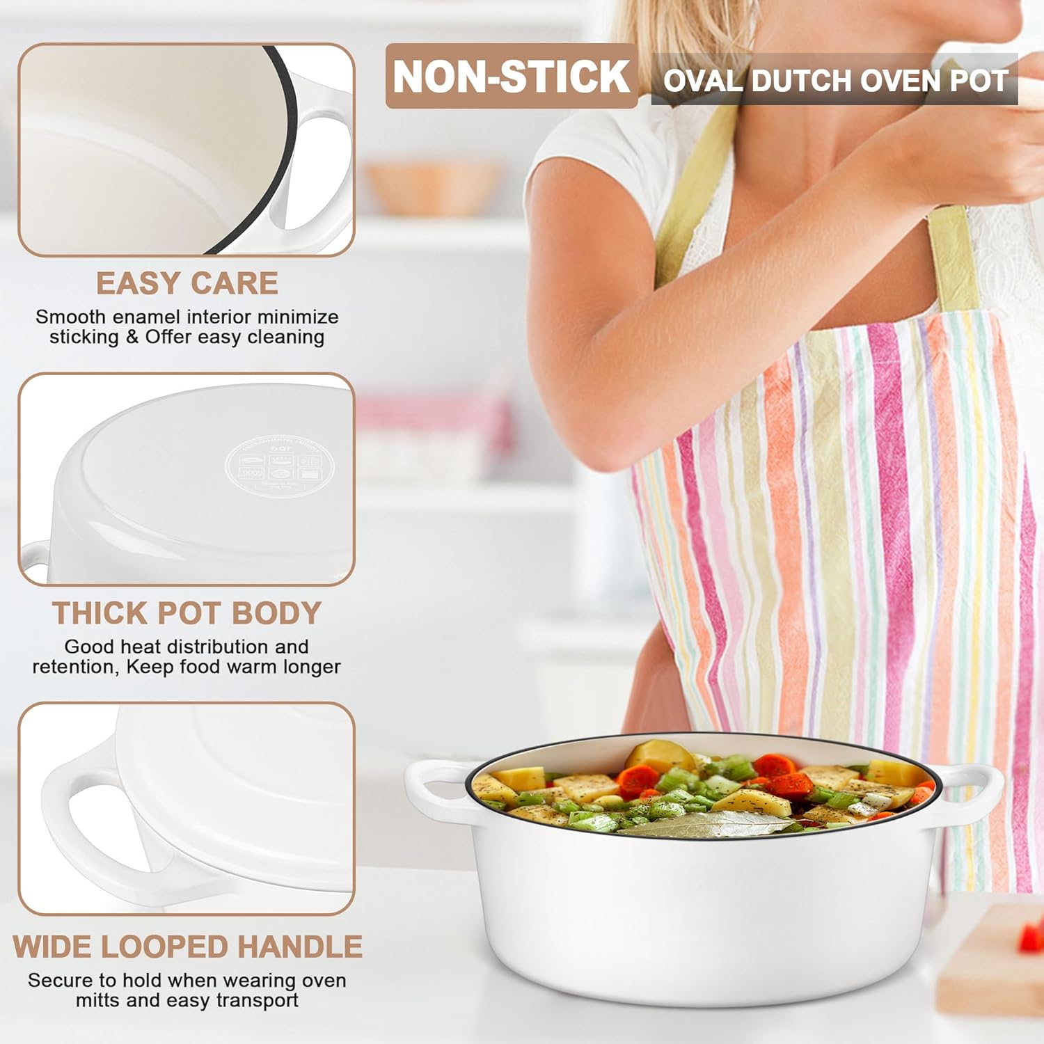- PERFECT SIZE & MULTI PURPOSE: Oval shape with 5qt ample size perfect for a full sized chicken or oblong sourdough loaf, Go nicely from oven for baking artisan bread/casserole to stove top for soup/stews, Or directly to table for serving with its rustic white look, Versatile for broiling, braising, frying, sauteing