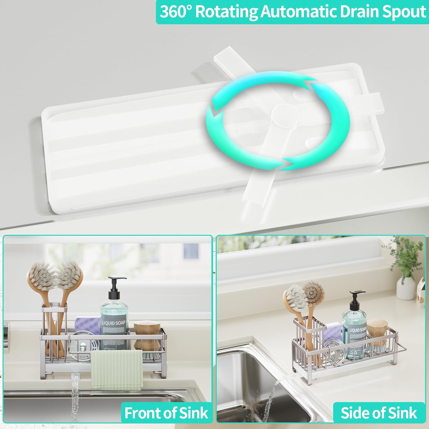 - [360° Rotating Drainage]: Tired of waterlogged counters? The 360° rotating drainage pipe on our sink caddy ensures your kitchen stays dry and clean, effortlessly directing water into the sink. The drain pipe is removable, so you can remove it for cleaning