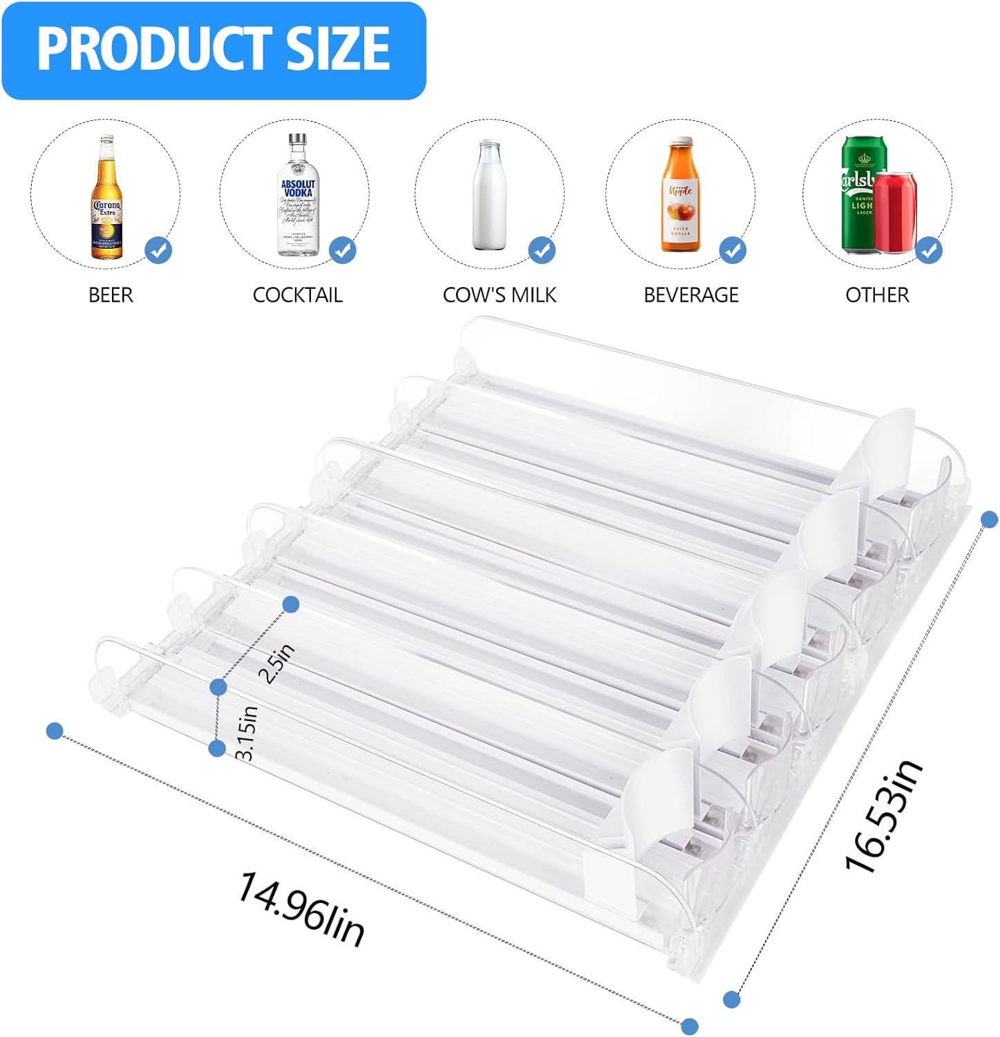 - Simple Assembly and Maintenance: drinks organizer for fridge requires no tools for assembly taking just a few minutes to put together by hand; its smooth surface and waterproof material also make for effortless cleaning and maintenance