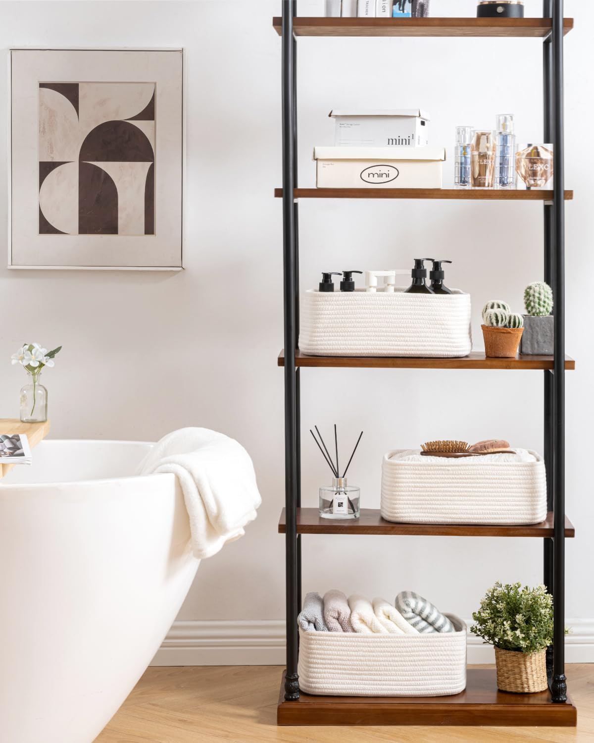 - [ Elegantly Designed to Match Any Décor ] Our small rope basket creates a minimalist appearance, and it adds a touch of warmth and texture to any room. The classic solid color design ensures seamless integration with your existing aesthetics, complementing any decoration. Perfect as decorative storage baskets for shelves, cabinets, and any open display space, making them a stylish and practical addition to any decor, enhancing the overall aesthetics of your room