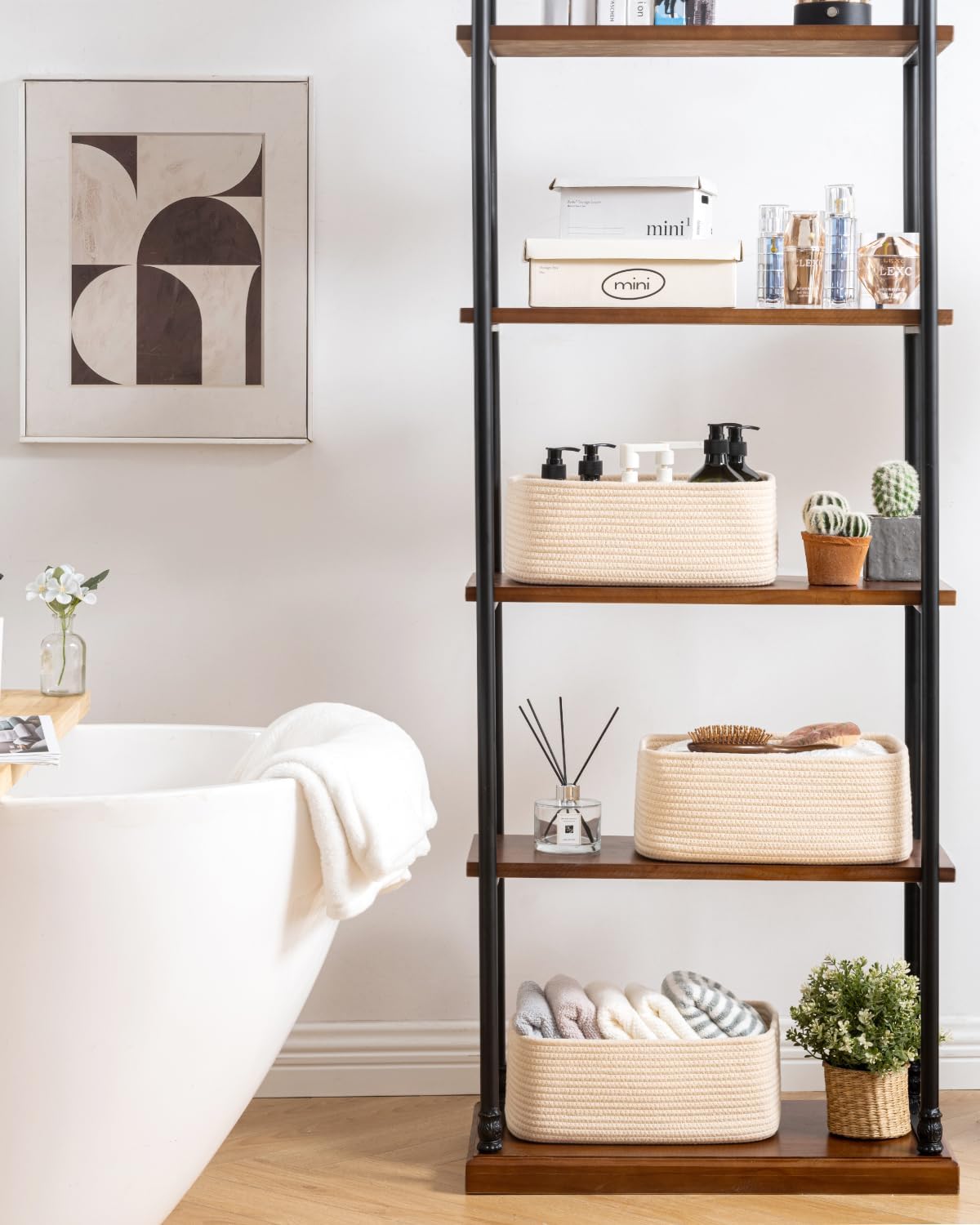 - [ Elegantly Designed to Match Any Décor ] Our small rope basket creates a minimalist appearance, and it adds a touch of warmth and texture to any room. The classic solid color design ensures seamless integration with your existing aesthetics, complementing any decoration. Perfect as decorative storage baskets for shelves, cabinets, and any open display space, making them a stylish and practical addition to any decor, enhancing the overall aesthetics of your room