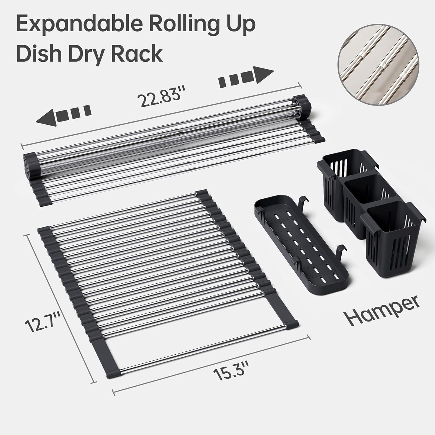 Expandable Over Sink Dish Drying Rack, Large Roll Up Dish Drying Rack with 2 Storage Baskets, Rolling Drain Mats for Kitchen Sink Counter, BPA-Free(12-22 * 15.3'', Black)