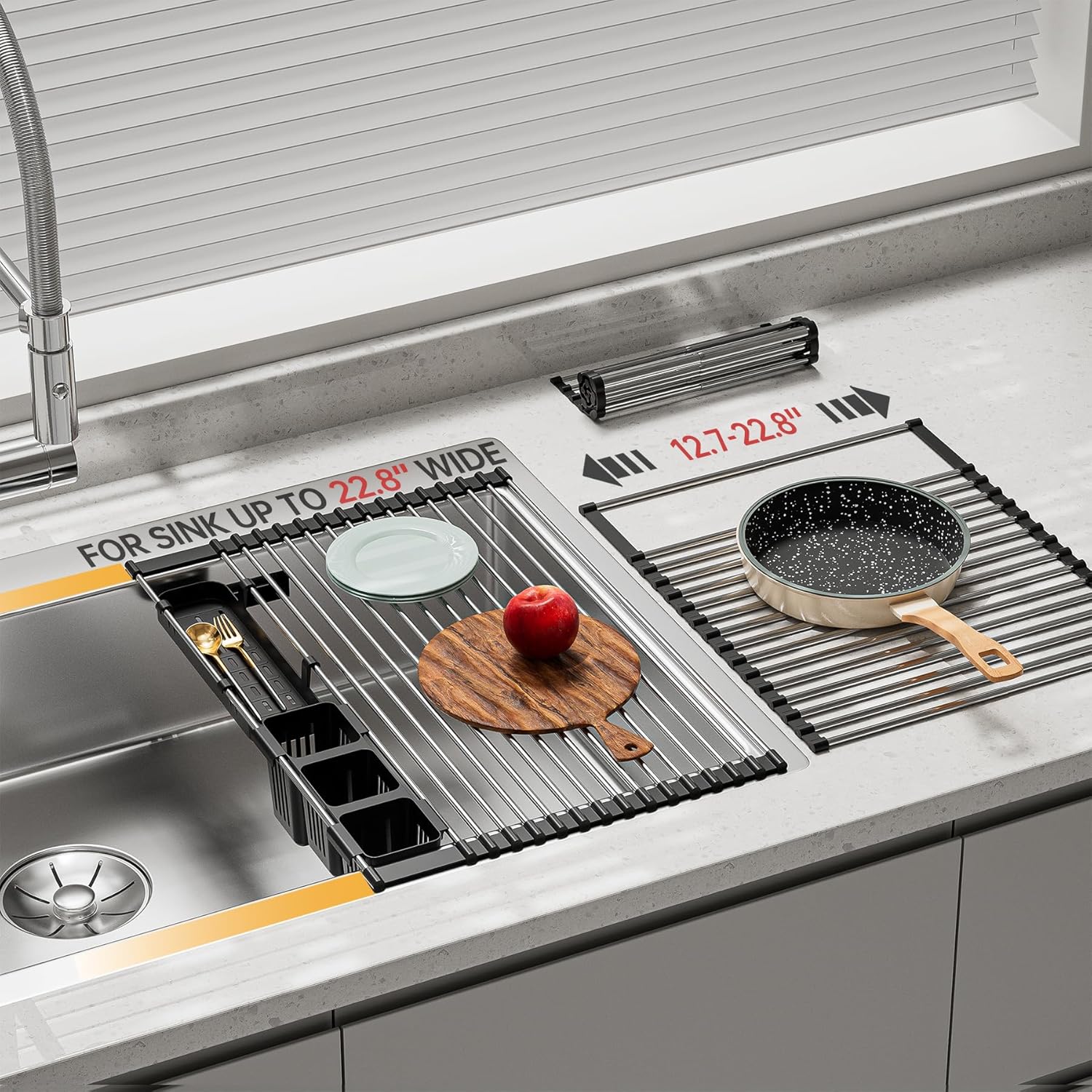 - Extensible Design: The length of the over sink dish drying rack can be adjusted according to your needs. The rack size is adjustable from 12.7 to 22.8" (length) x 15.3"(width).The roll-up dish drying rack is suitable for most sink sizes, but it is better to confirm the size of the sink before purchasing.It's sturdy and easy to clean, making it ideal for drying fruit, spoons, dishes, vegetables, etc.