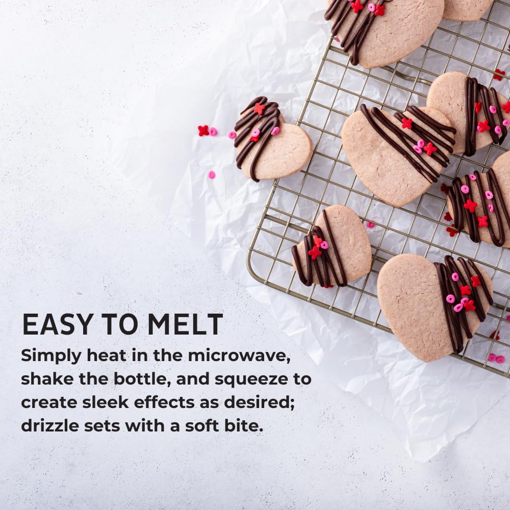 - EASY TO MELT: Simply heat in the microwave, cool slightly, shake bottle and squeeze to create sleek effects as desired; drizzle sets with a soft bite; this 10 oz bottle will coat the top and drip the sides of one 8” cake