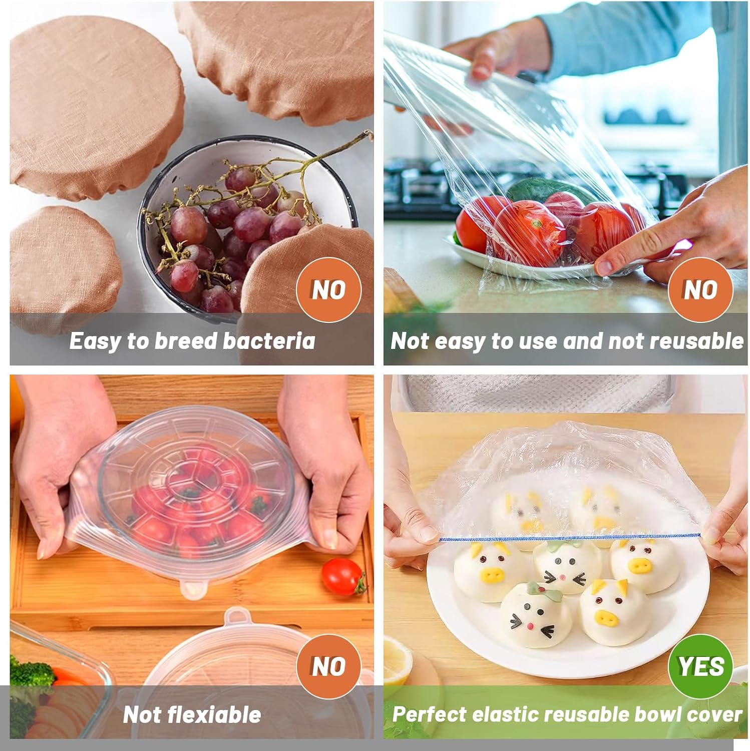 - Reusable elastic plastic covers: Good elasticcity, elastic edges fit snugly on bowls plates and containers