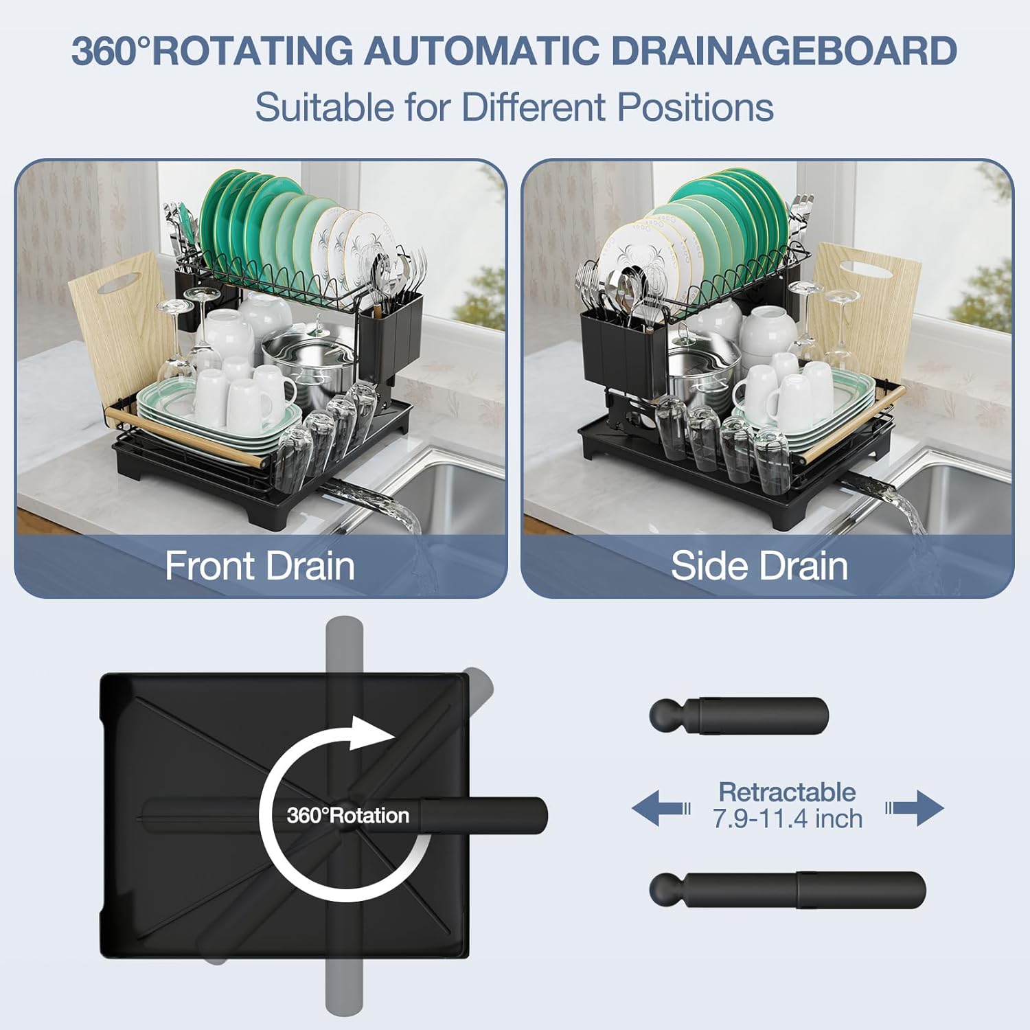 - Efficient Drainage System: This dish drying rack with drainboard is designed with a removable drainboard which includes central drainage holes and a drainage channel, making sure the water flows directly into the sink and not the countertop. The retractable drainpipe can be rotated 360° which is easy to adjust the placement of the dish drainers for kitchen countertop more freely according to the position of the sink. Perfect for avoiding leaks and draining water efficiently. (Note: Make sure your kitchen sink is flush with the counter for better fitting the height of drainboard.)