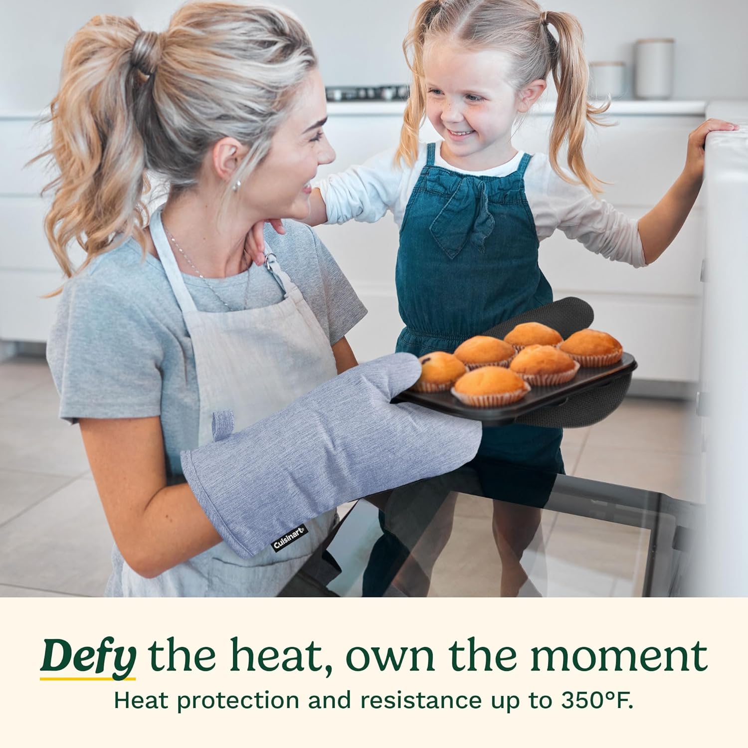 - COOK WITH CONFIDENCE: The Cuisinart Chambray Oven Mitt Set, measuring 7 x 13 inches, features a heat-resistant neoprene palm for superior protection (up to 350 degrees); handle hot cookware with ease and enjoy a secure grip with these oven mits, making cooking, baking, and grilling safer.